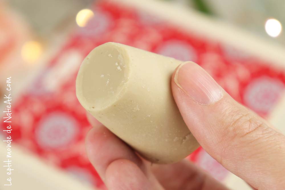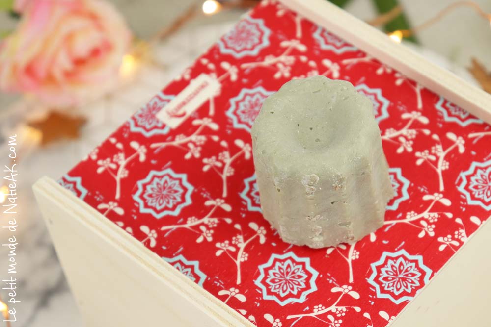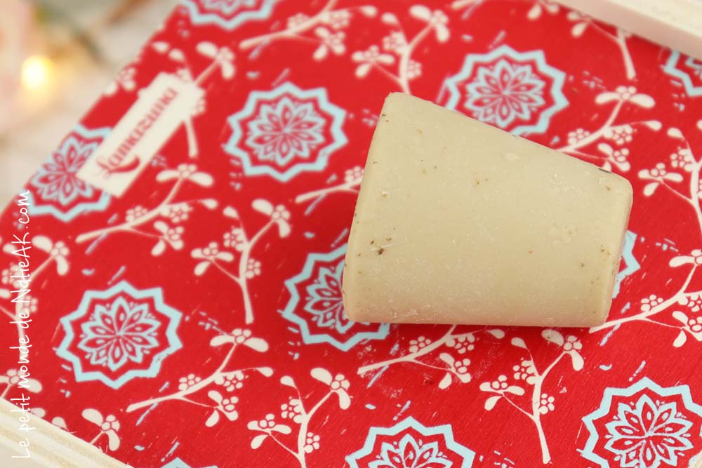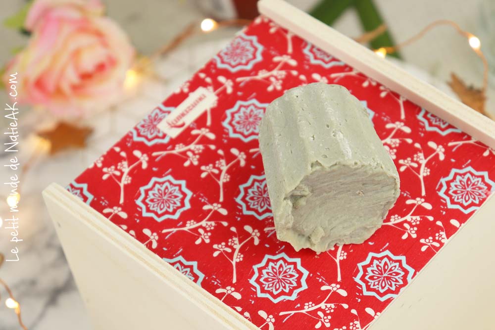 On termine avec le shampoing solide au pin Sylvestre de Lamazuna. Il se présente normalement dans un emballage cartonné biodégradable, mais étonnamment, cela n’a pas été le cas puisque le shampoing solide a été placé dans la boîte sans aucune protection : je ne sais pas ce qui s’est passé !