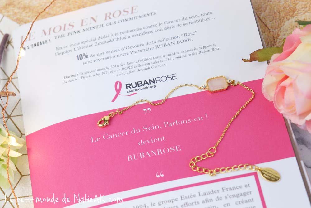 En effet, chaque année, ce sont 60 000 femmes qui se battent contre le cancer du sein. En se faisant dépister tous les deux ans, la survie d’un cancer du sein découvert à un stade précoce est de 99 %. Pour aider à la recherche, L’Atelier Emma & Chloé reverse en octobre 10 % des ventes de sa collection Rose à L’Association Ruban Rose (anciennement Le cancer du Sein, Parlons-en !).