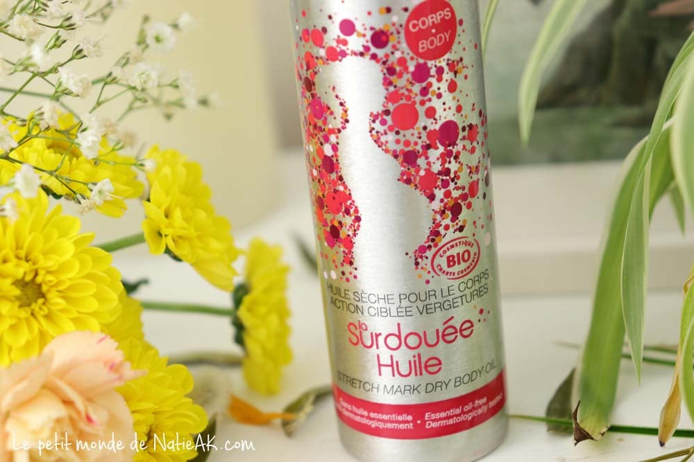 Commençons par le OUT avec La surdouée Huile Bio, une huile sèche pour le corps proposant une action ciblée sur les vergetures. Notons que les vergetures peuvent toucher toutes les femmes : elles sont occasionnées lors de bouleversements hormonales ou en cas d’étirements cutanés et se caractérisent par la présence de cicatrices blanches. On peut les prévenir en hydratant la peau.