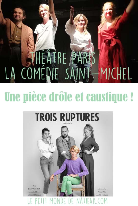 Nous poursuivons avec ma fille nos découvertes théâtrales : après Le Bel Indifférent, nous avons choisi la pièce Trois ruptures au Théâtre La Comédie Saint-Michel. Nous restons donc dans le thème du couple, au moment de sa séparation, séparation que l’auteur Rémi De Vos a voulu insolite, piquante et même comique ! Voici notre retour sur ce huis clos dynamique d’une cruauté hilarante !