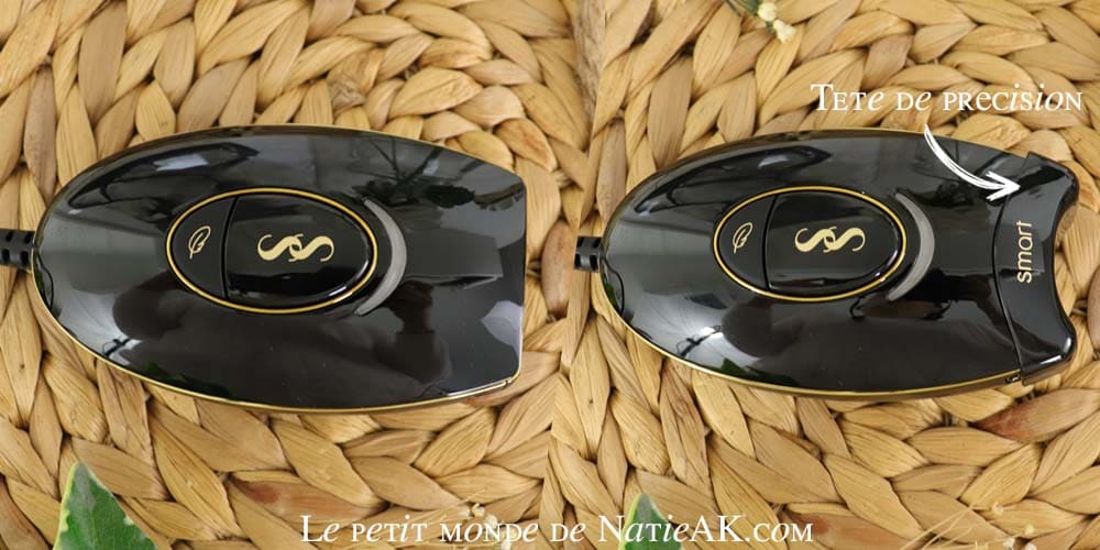 La tête de précision : pour atteindre plus facilement les zones arrondies (doigts, orteils, cheville, lèvre supérieure…), l’appareil dispose d’un accessoire nommé Tête de précision qui se fixe très facilement sur l’avant du SmoothSkin Pure Mini, grâce à un système aimanté. Cela permet d’utiliser l’appareil sur toutes les surfaces du corps sans difficulté.