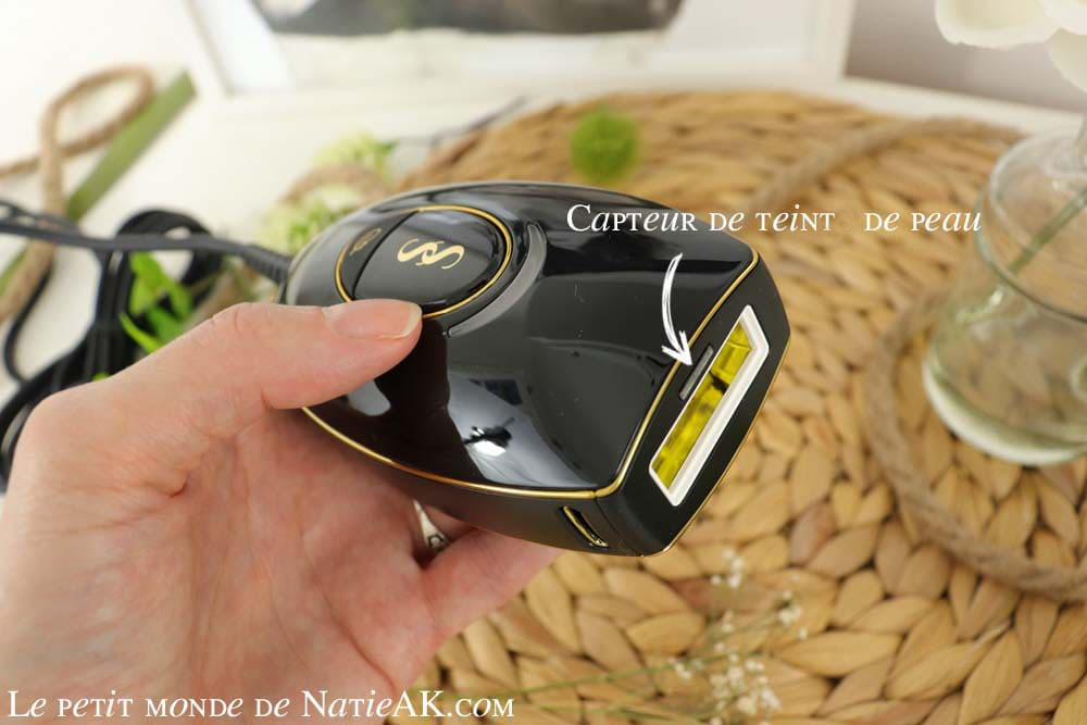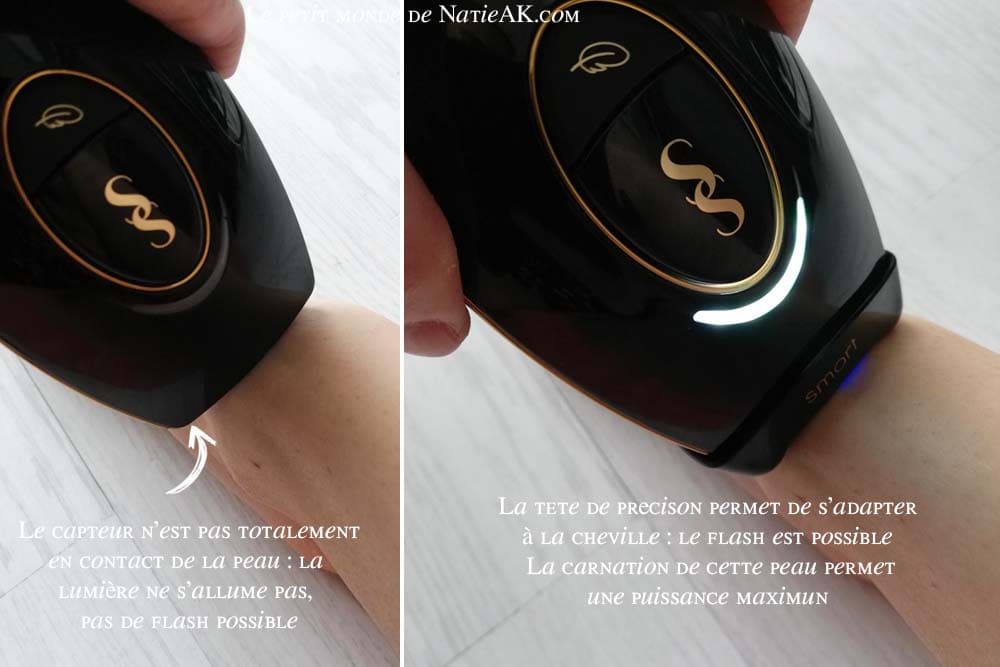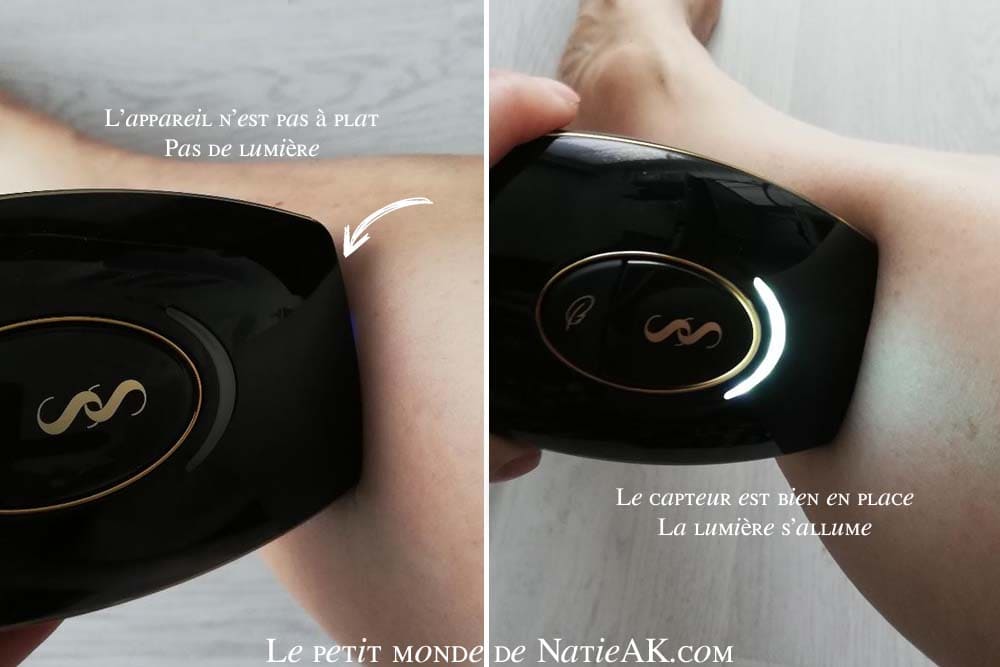 C’est une spécificité très intéressante, car selon les zones du corps, on peut avoir une peau plus foncée. L’intensité de l’énergie lumineuse (la lumière clignote à chaque fois que la capteur vérifie la peau) est alors automatiquement réévaluée, ce qui fait gagner du temps dans la séance, puisqu’on n’a pas besoin d’y penser.