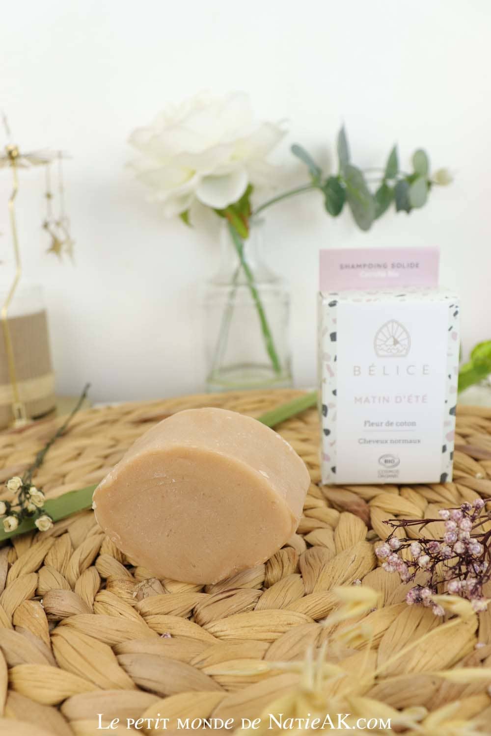 Commençons pour les shampoings tous en format solide. Bélice et son shampoing solide pour cheveux normaux nommé Fleur de coton Matin d’été, est un soin lavant que je reprends très régulièrement. Je vous invite à relire notre avis sur cet article Belle au naturel : la box beauté Bio Made in France 100 % personnalisable (+ Box Mars 2023)