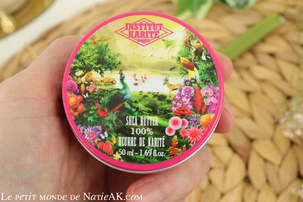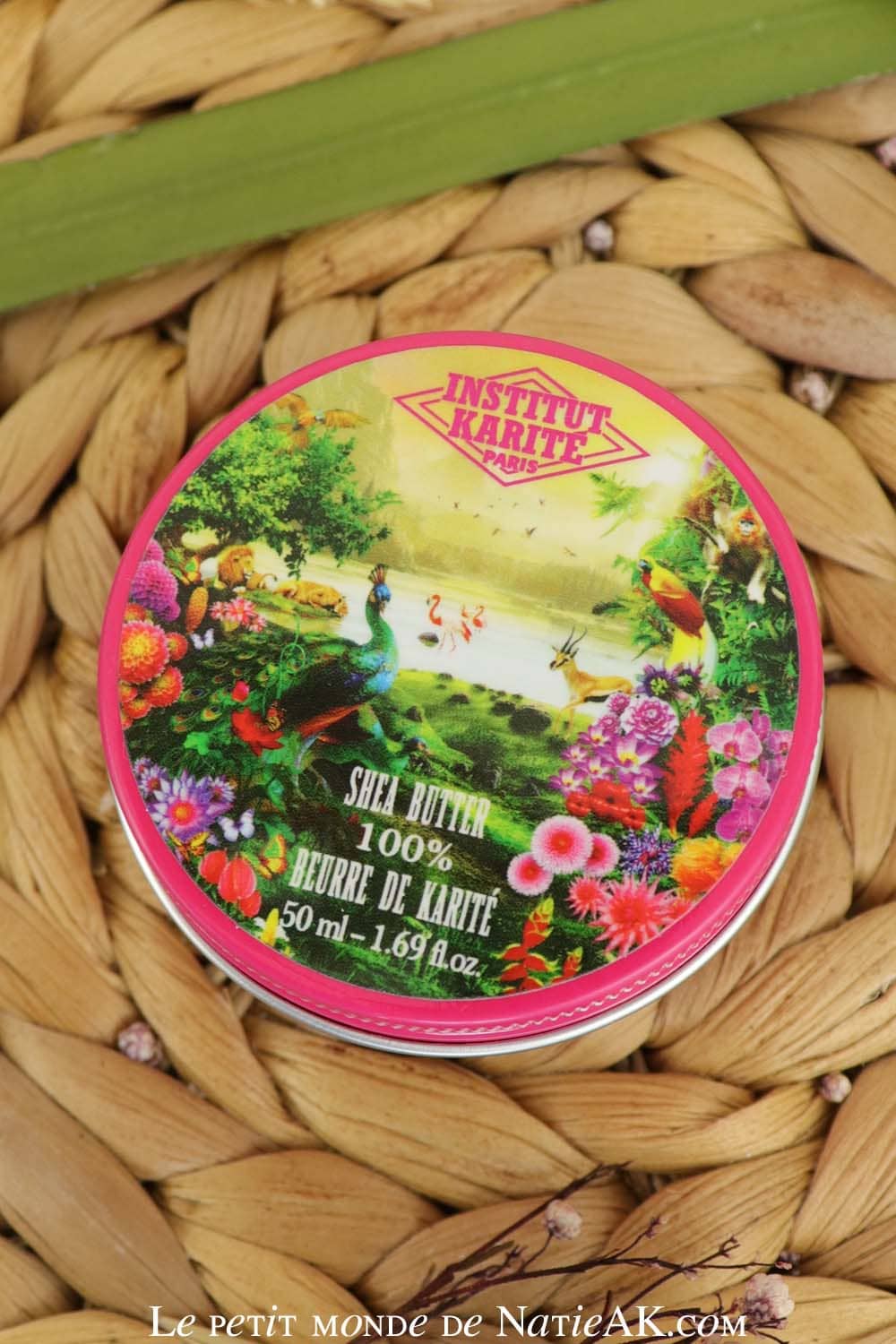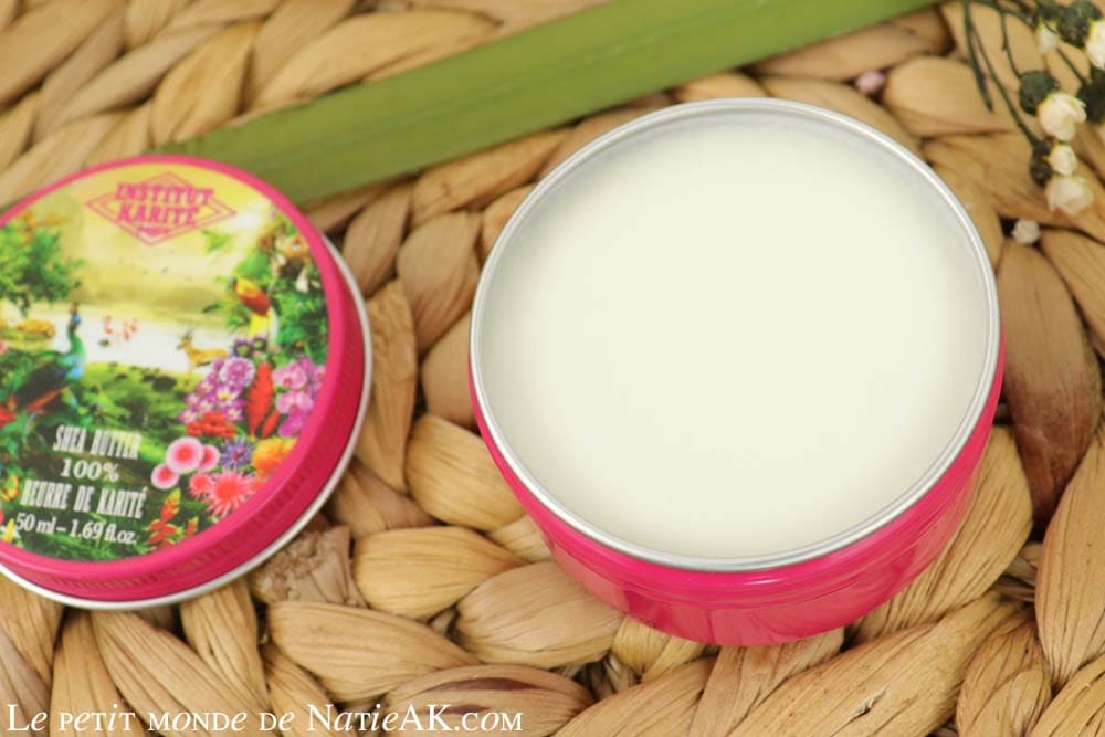 j’ai pris le pur beurre de karité de Institut Karité Paris : celui-ci se présente dans une jolie boîte en aluminium au couleur girly. Ce soin contenant 100% beurre de karité, destiné à toutes les peaux même sensibles, peut être utilisé sur l’ensemble du corps, cheveux et visage, afin de protéger, apaiser, nourrir et hydrater intensément la peau.