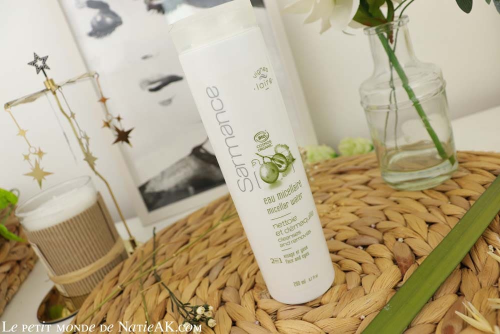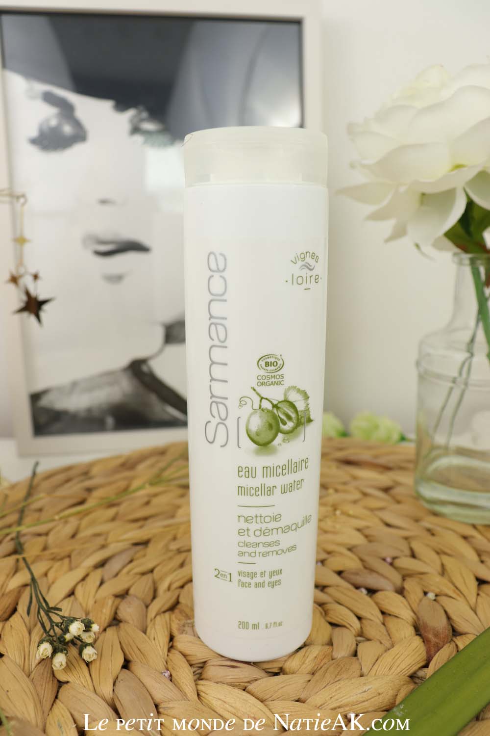Par contre, je découvre grâce à la box la marque Sarmance et son eau micellaire bio démaquillante. Sarmance valorise la cosmétique des vignes bio et des pépins de raisin. Sarmance propose des soins biologiques, tous fabriqués en France. Parmi leur produit, cette eau micellaire promet de démaquiller avec douceur la peau, en offrant des bienfaits purifiants et nettoyants. Sarmance a misé dans cette formule à 98,4 % d’ingrédients naturels (dont 30,5 % issus de l’agriculture biologique) de l’eau de vigne de Loire Bio, de la glycérine (hydratant) et des tensions actifs doux.