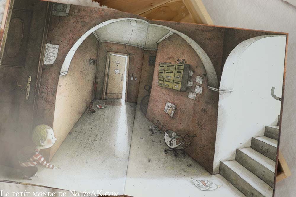 L’immeuble dans lequel s’aventure le petit garçon s’ouvre sur une cage d’escalier taguée, comme laissée à l’abandon. Cette sorte de grande propriété, où les murs des parties communes sont envahis de tableaux, de portraits d’enfants qu’on ne voit jamais, et de clefs dont on se demande ce qu’elles ouvrent, est complètement vide d’occupants. Pourtant, l’immeuble n’est pas abandonné : une table est dressée, la bibliothèque est remplie de livres, des bouteilles au contenu inconnu trônent un peu partout. Pour un enfant, c’est une caverne au trésor, mais pour un regard adulte, plus le livre avance, plus cette assourdissante solitude n’a pas l’air naturelle.