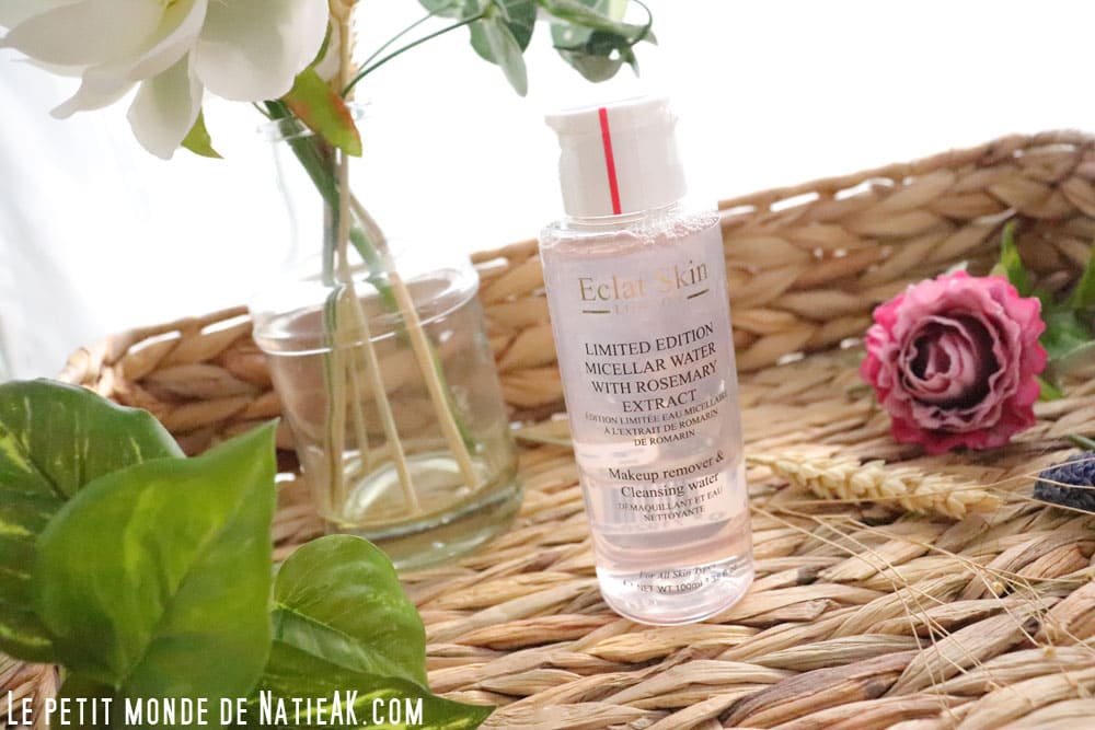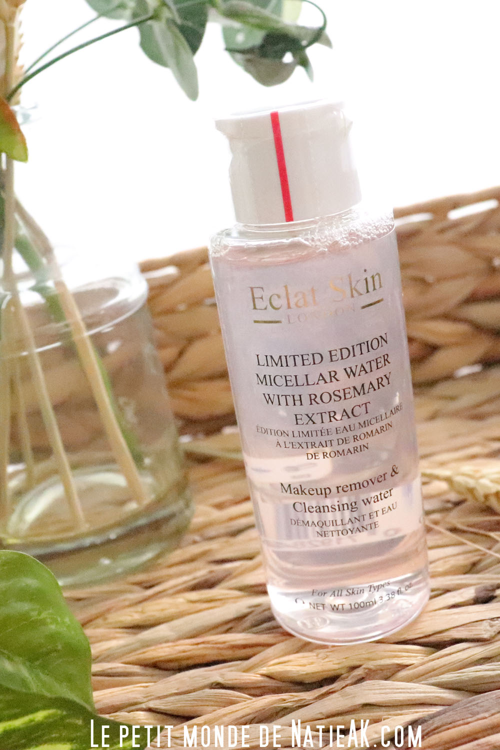 On commence notre routine fraîcheur par l’eau micellaire de la marque Eclat Skin. À la fois eau démaquillante et nettoyante, ce soin contient de l’infusion d’extrait de romarin (pouvoir antiseptique), capable de réduire les imperfections de peau. L’extrait de pivoine qui l’accompagne apaise la peau du fait de ses vertus anti inflammatoires et anti oxydantes. Je note également la présence d’huile de tournesol et de glycérine qui apporteront un aspect hydratant.