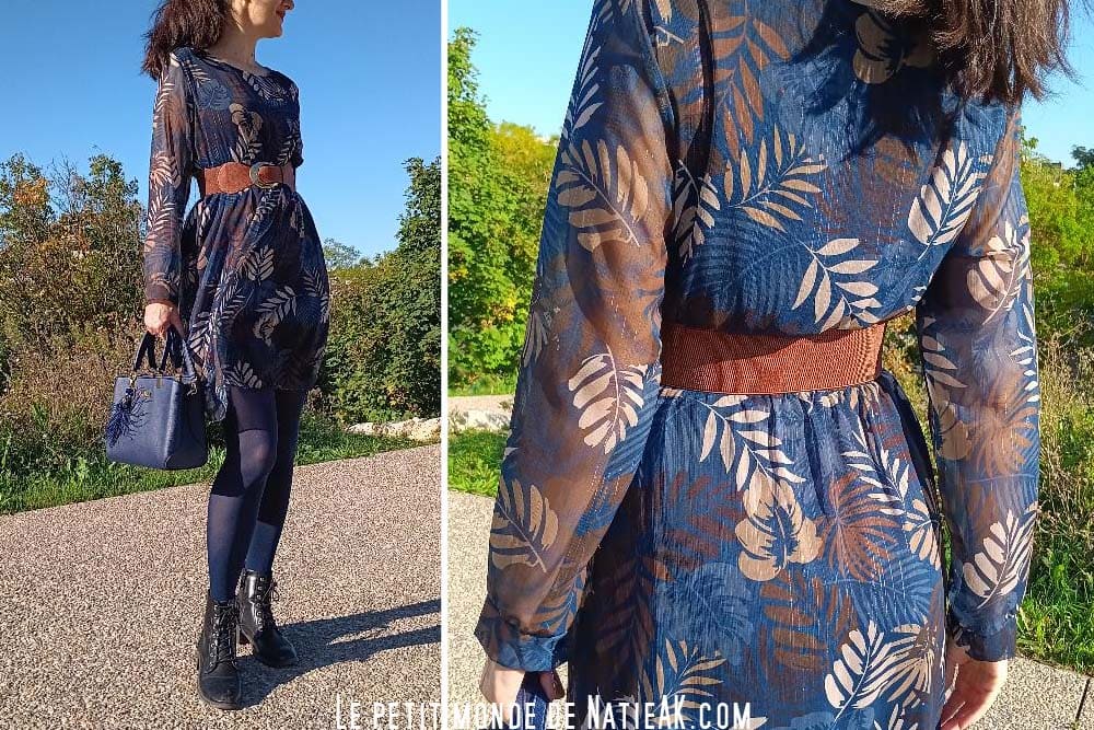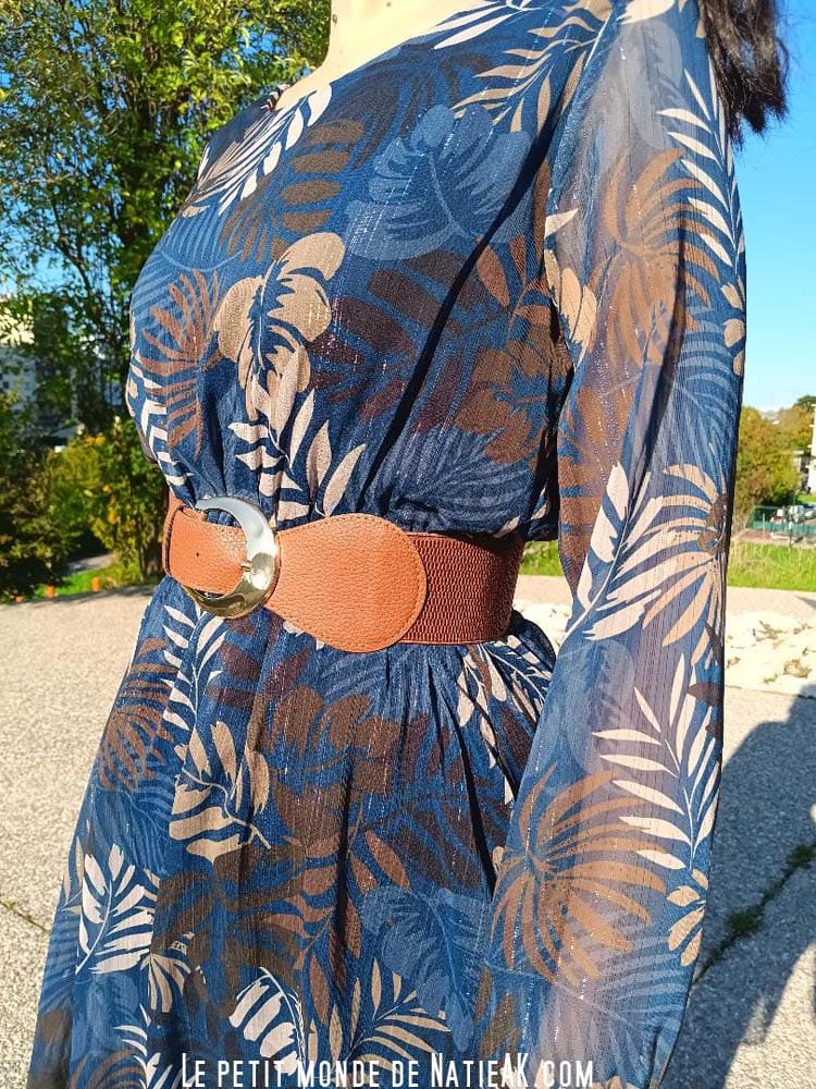 En septembre, j’ai eu l’occasion de participer à la soirée d’anniversaire d’Inspee : DJ, gourmandises, bijouterie, ainsi qu’une présentation de la collection automne. Comme c’est toujours plus sympathique à deux, j’ai proposé à Elodie du blog SerenaMente de m’accompagner. On a retrouvé sur place Flore du blog Bulles de tests chez Florette. Nous avons pu essayer plusieurs tenues, afin de sélectionner notre préférée. J’ai finalement jeté mon dévolu sur cette magnifique robe en voile lamé : un tissu léger aux motifs de feuilles tropicales avec ceinture.