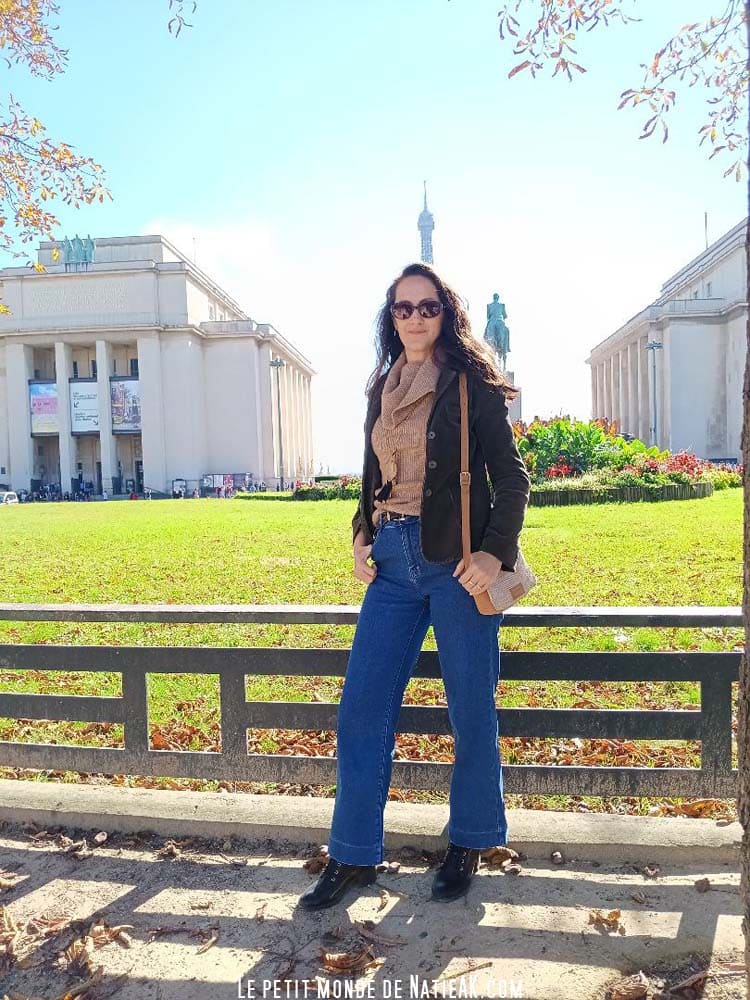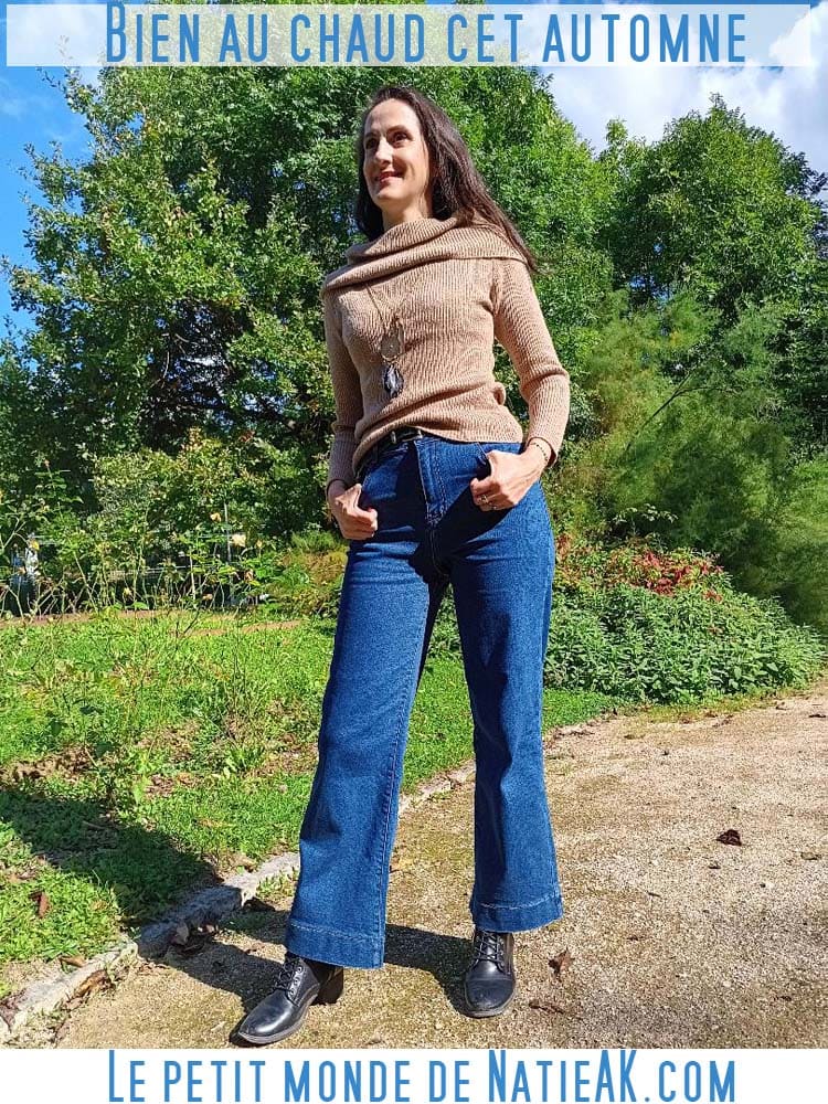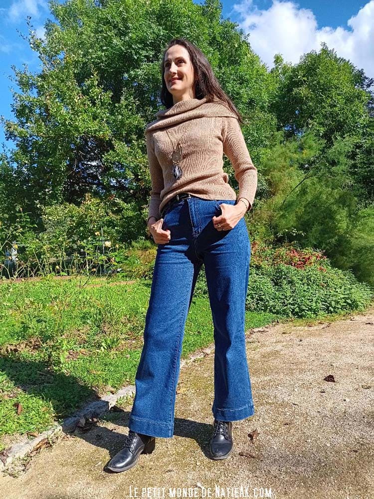 J’ai associé le pull à ce pantalon jean wide leg : il offre ainsi une coupe ample au niveau des cuisses et ajousté à la taille. Avec sa taille haute, il permet d’offrir une allure élancée et ainsi valoriser la silhouette. Il est très confortable, que l’on soit assise, debout et même après un repas, grâce à sa matière extensible. Là encore, je l’ai associé à une veste en velours qui vient d’un vide-grenier. Je trouve que l’ensemble des trois pièces donne un côté rétro qui me plaît bien.