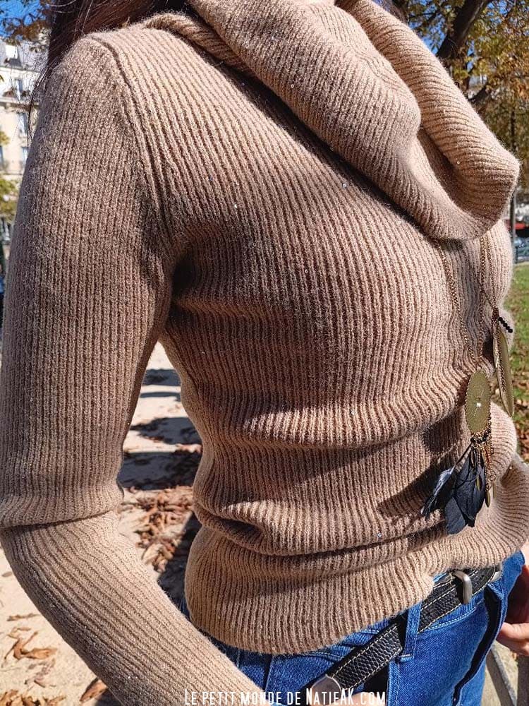Commençons par le haut d’une couleur taupe, une teinte neutre (entre le gris et le marron) qui peut facilement associer à d’autres couleurs. Ce pull côtelé irisé à col montant, est un petit bijou. En plus d’être bien chaud et confortable, il offre une matière souple agréable au toucher. On peut même le porter à même la peau, car il ne gratte absolument pas.