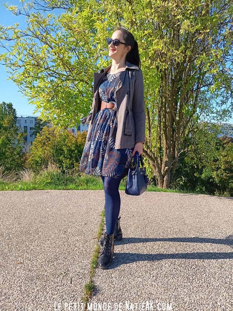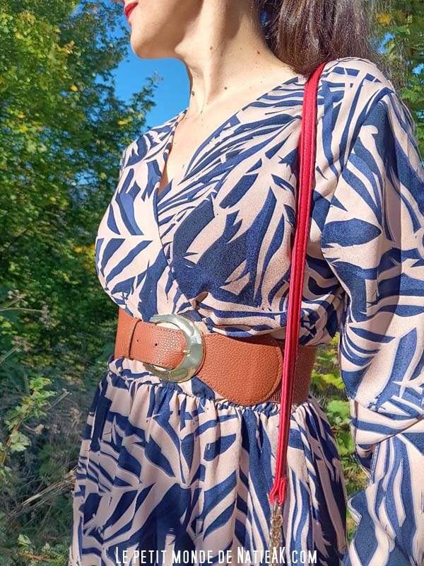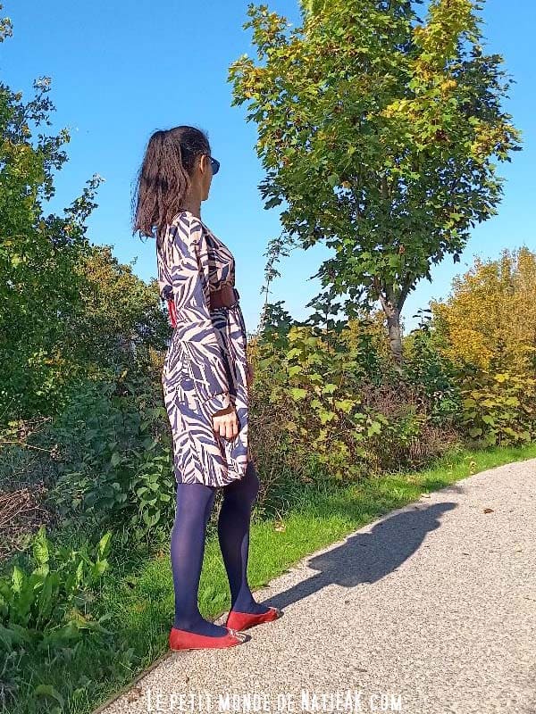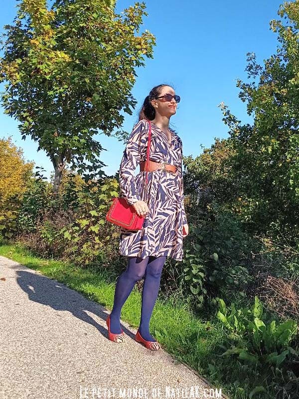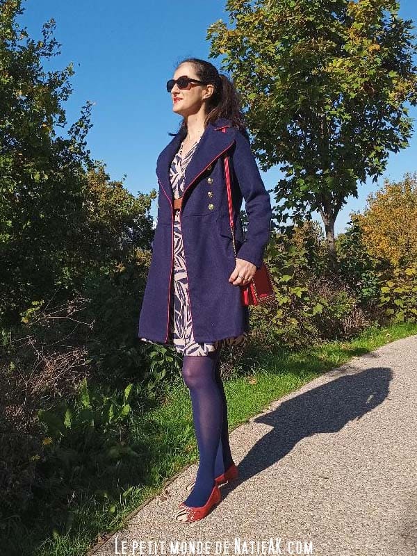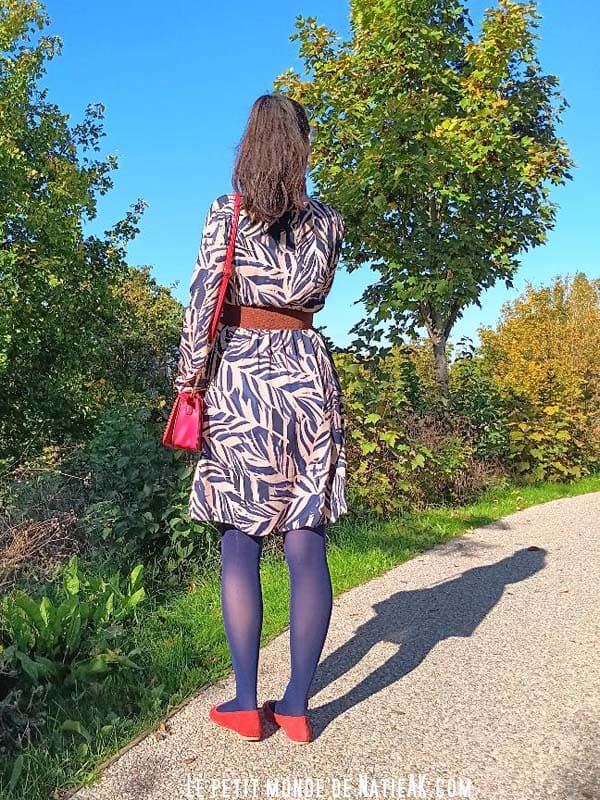 Dans un second temps, j’ai pu choisir trois pièces parmi une sélection : j’ai encore craqué pour une robe avec ceinture. J’aime son tissu fluide ultra confortable aux imprimés feuilles. Elle a une jolie longueur malgré mon 1 m 73, en plus d’être doublée. Encore une fois, j’ai complété cette robe fabriquée en Italie, avec des pièces que je possède depuis longtemps dans mon dressing : un ancien manteau bleu marine avec un liseré rouge, dont j’ai fait un rappel avec le sac à main et les chaussures. Remarquez l’extrémité des souliers qui offre des motifs similaires à la robe.