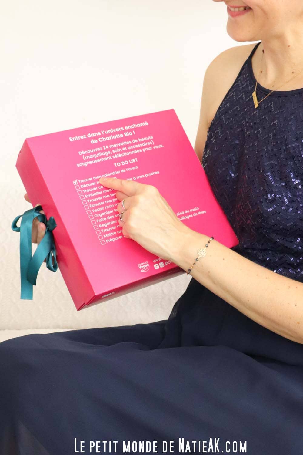 Côté packaging ? Un revêtement rose fushia sublimé par des motifs végétaux argentés offrant un effet miroir. Je sais déjà qu’il sera upcyclé dans mes projets de loisirs créatif. On pourra tout aussi bien le conserver pour y glisser l’an prochain ses surprises dans les différentes boîtes. Au dos, la marque nous propose une To do list pour passer un mois de décembre magique : on pourra d’ors et déjà cocher la case » calendrier de l’avent « .