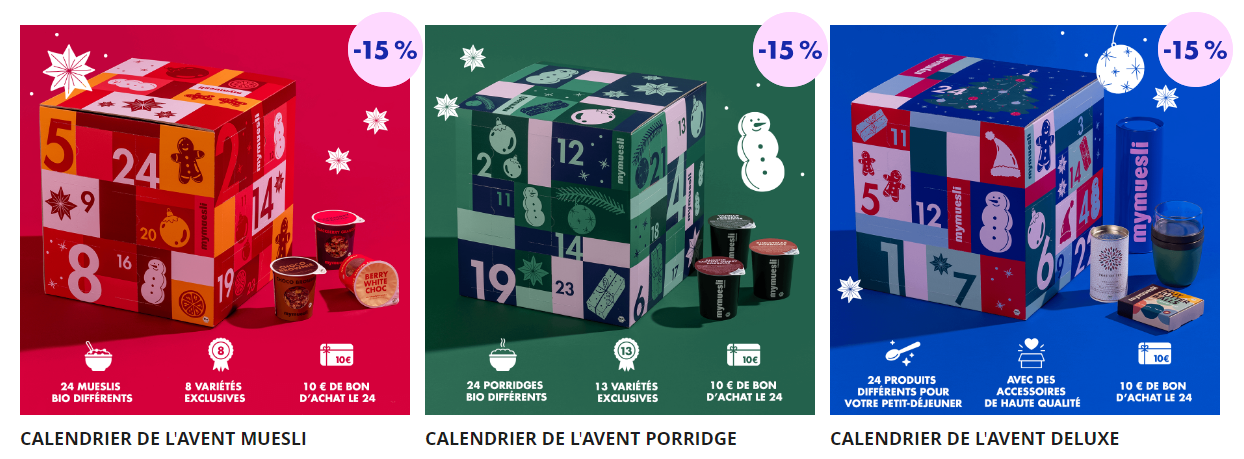 👉 My Muesli propose ainsi pour les fêtes de fin d’années trois calendriers de l’avent pour un max de plaisir : Deluxe, Porridge et Muesli.