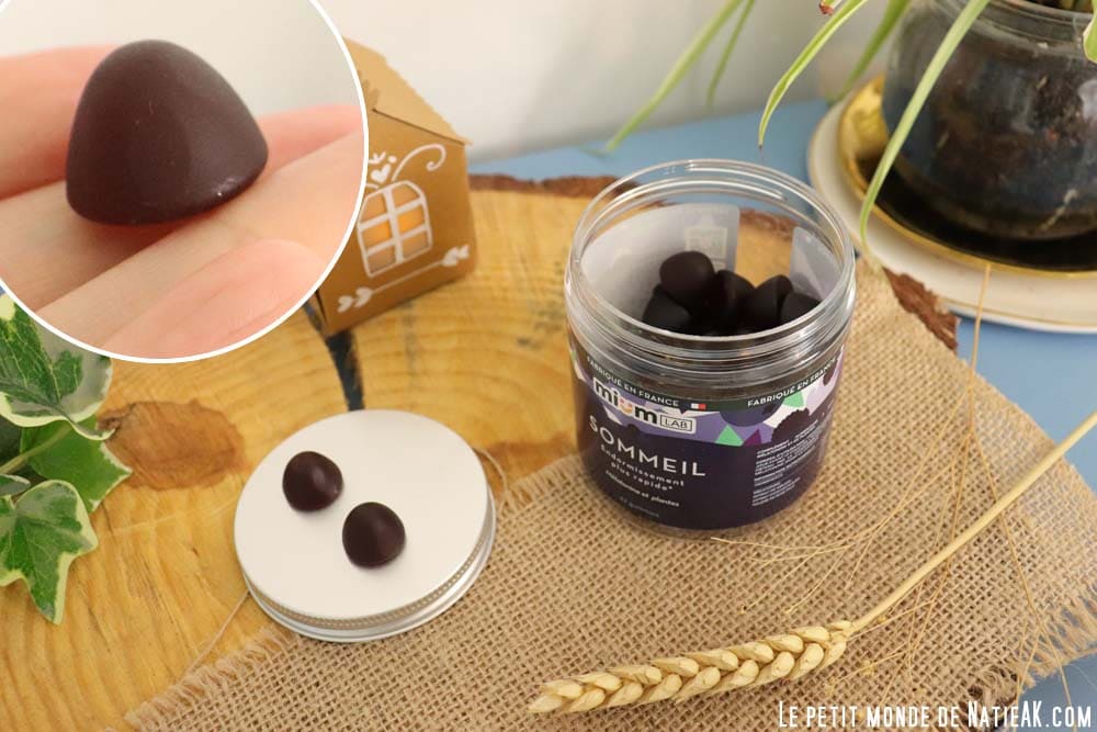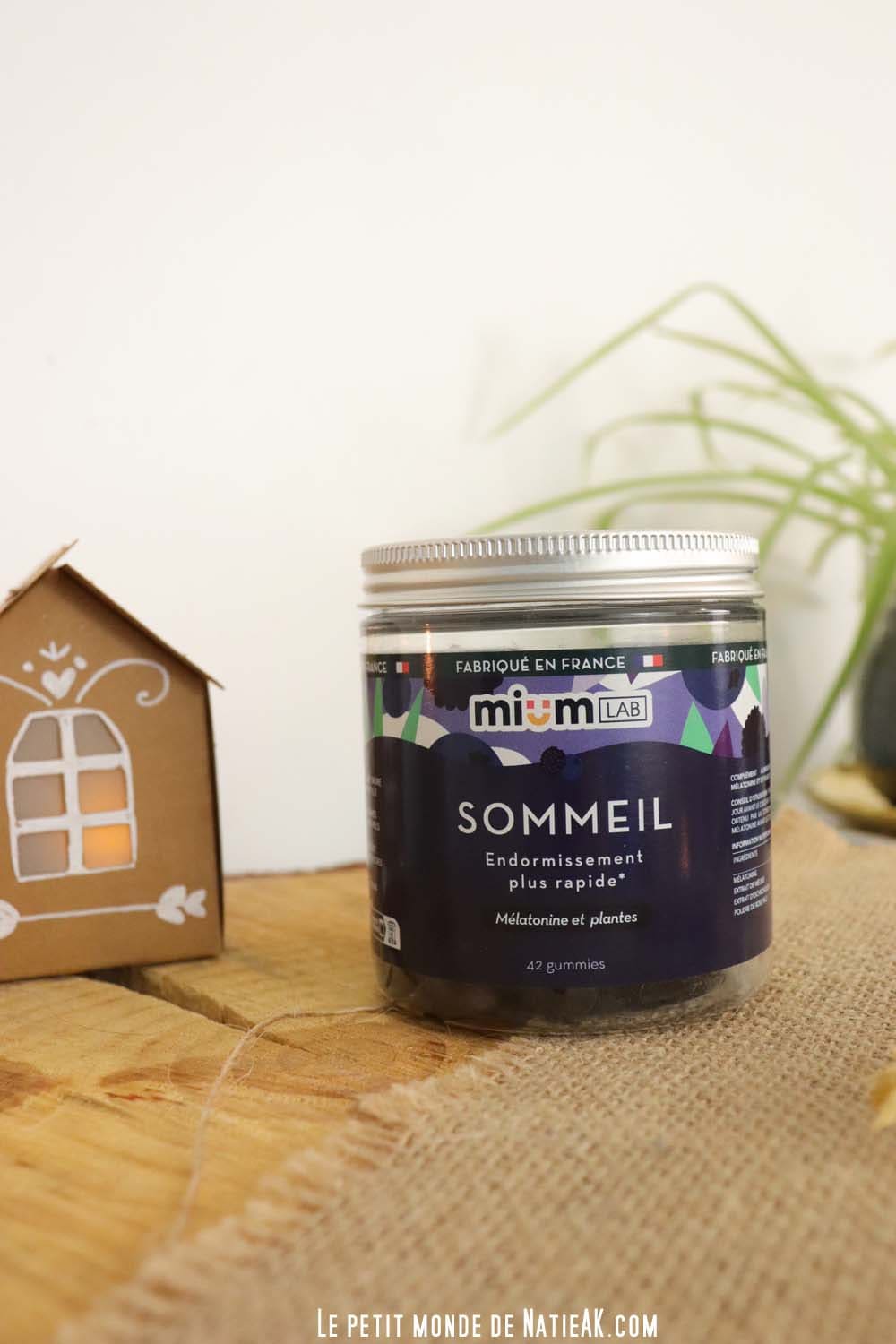 Je termine avec ces compléments alimentaires vegans destinés à favoriser l’endormissement et offrir une nuit réparatrice. Fabriqué en France, Mium Lab a notamment opté pour de la mélatonine, de la Mélisse (effet sédatif, favorise le sommeil), le Pavot de Californie (permet un sommeil paisible et réparateur) et la rose pâle (facilite l’endormissement, origine non UE, pays et type de culture non spécifié), ainsi que des arômes naturels. La présence de jus concentré de myrtille apporte un parfum fruité dès l’ouverture du pot. Notons qu’il est préférable des prendre les gummies avant le brossage des dents, du fait de la présence de sucre.