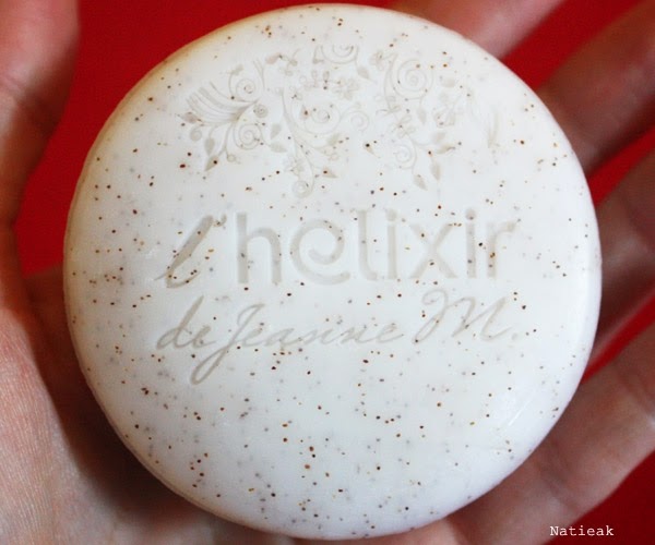 J’ai été tout de suite séduite par le joli design du savon. On peut y voir des gravures florales sur le savon ainsi que le nom de la marque qui est aussi gravée dans le savon. De couleur gris très clair, ce savon est parsemé de petits points marrons dû à la présence de la poudre de coque de noyau d’abricot. L’odeur est agréable sans être trop forte.