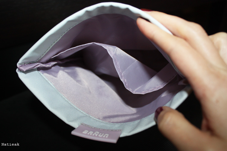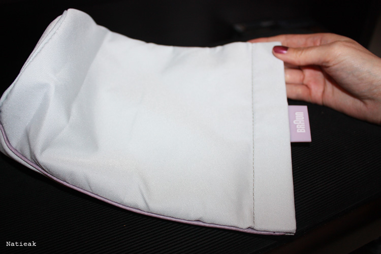 Un sac est fourni avec le coffret : il permet de ranger les différents accessoires. La fermeture est aimantée et l’intérieur comprend deux compartiments. La pochette est mal adapté pour le rangement de la brosse et la tête d’épilation.