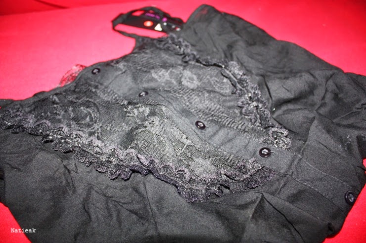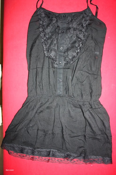 Visiblement le questionnaire a été très efficace car elle a bien aimé le contenu de cette box dont voici le détail du contenu. Pour commencer, cette box mode se compose d’un petite robe tunique noir à dentelle avec des bretelles réglables.