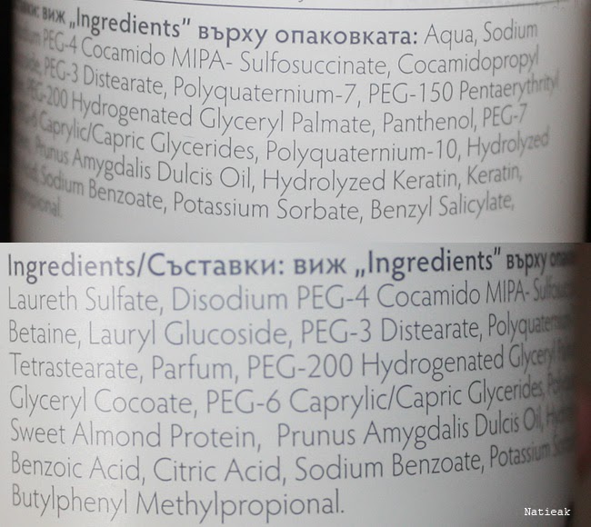 On retrouve en 17eme et 18eme position (sur 26 composants) la présence d’huile d’amande douce et de proteines d’amandes douce sous le nom de Prunus amygdalusdulcis oil et Hydrolyzed sweet almons protein. Il y a aussi de la kératine.