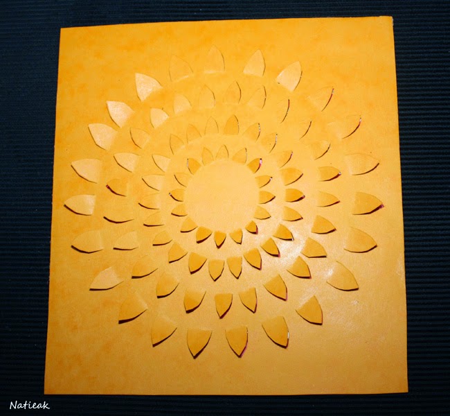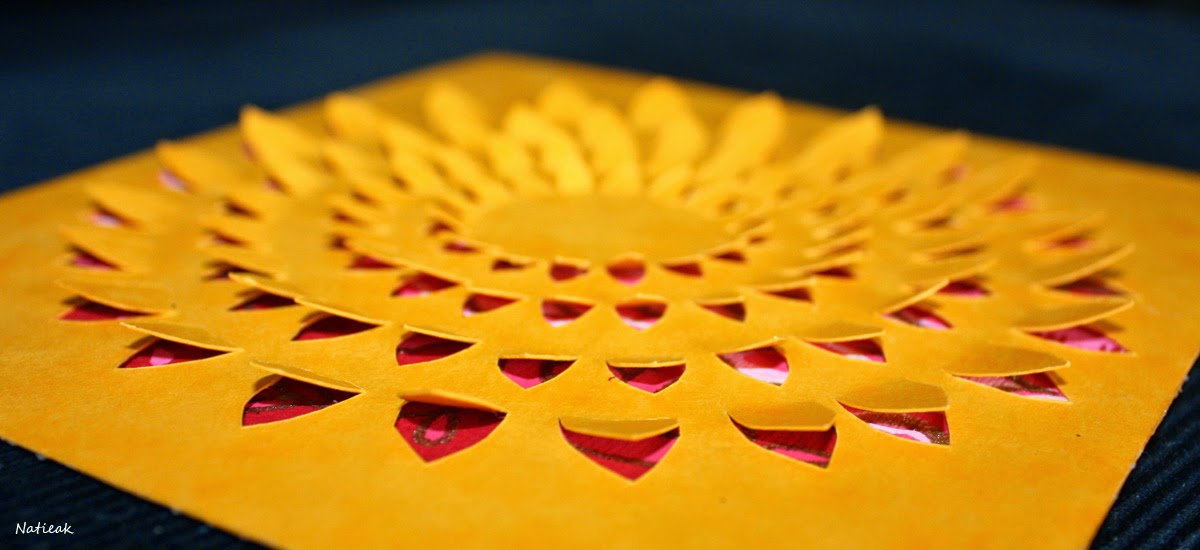 J’ai réalisé avec les feuilles roses, rouges et dorées cette carte pétales avec un effet relief. Autant vous dire que ma carte a fait son petit effet à la personne qui l’a reçu.