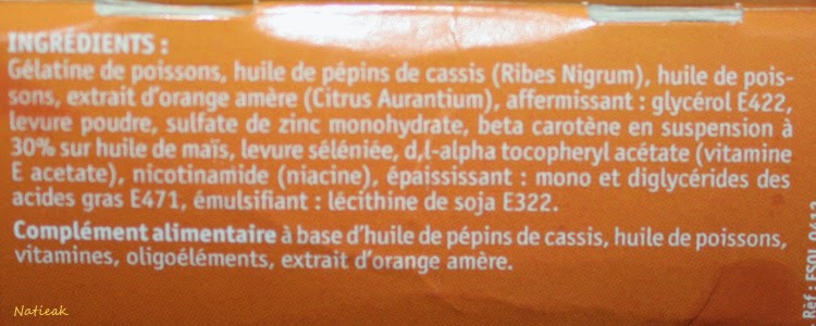 - Léro solaire : Vitamine PP, acide gras oméga 6 (huile de pépins de cassis) et oméga 3 (huile de poissons), carotène, Zinc et extrait d’orange amère. Environ 11 € les 30 capsules