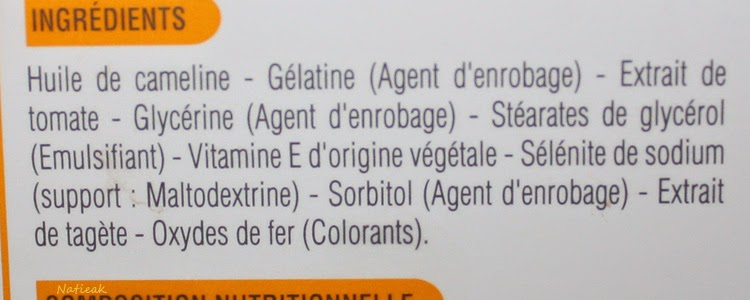 - Oenibiol solaire intensif : des oméga 3 (huile de cameline), des carotenoïde (extrait de tomate), des antioxydant pour se protéger des UV (extrait de tagète). Environ 22 €s les 2x 30 capsules