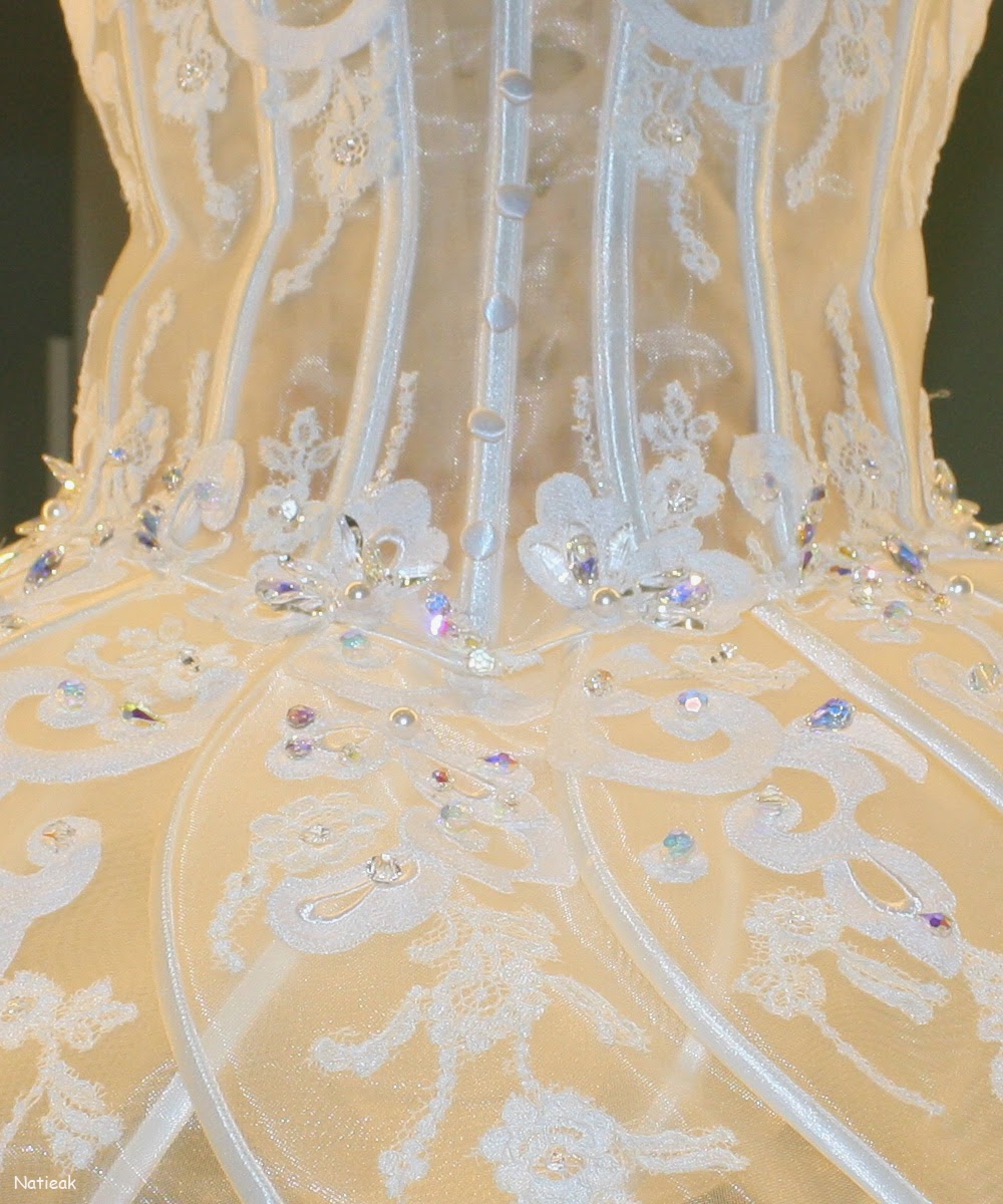 J’ai découvert grâce à Corinne, couturière chez Lejaby, comment été choisi les différentes pièces des parures. Le choix se porte sur des matières nobles issues de la haute couture : la dentelle de calais, la soie de Lyon et des broderies artisanales.