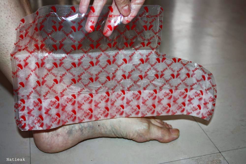 Puis on glisse son pied propre dans la chaussette et on colle trois autocollants (fournis dans l’emballage), afin de maintenir en place la chaussette. Je précise qu’il est noté qu’on peut se faire un bain de pied avant, pour améliorer l’efficacité du soin.