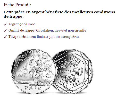 (*) Normalement une pièce “en argent” contient au moins 900/1000 d’argent pur, c’est le cas de toutes les pièces françaises ayant eu cours légal au 19ème et au 20ème siècle, c’est aussi le cas de la pièce de 50 € “Idéfix”.