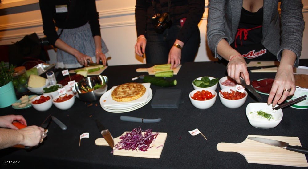 Les mini bouchées de tortilla et les tartelettes aux rubans de chorizo sont toutes aussi délicieuses, je vous les recommande. Vous trouverez en bas de l’article les trois recettes. Cela demande un peu de préparation notamment pour la crème de petit pois et le tortilla mais en s’y mettant à plusieurs, vous aurez le plaisir d’avoir un bon apéro. Voici nos préparations suite à l’atelier.