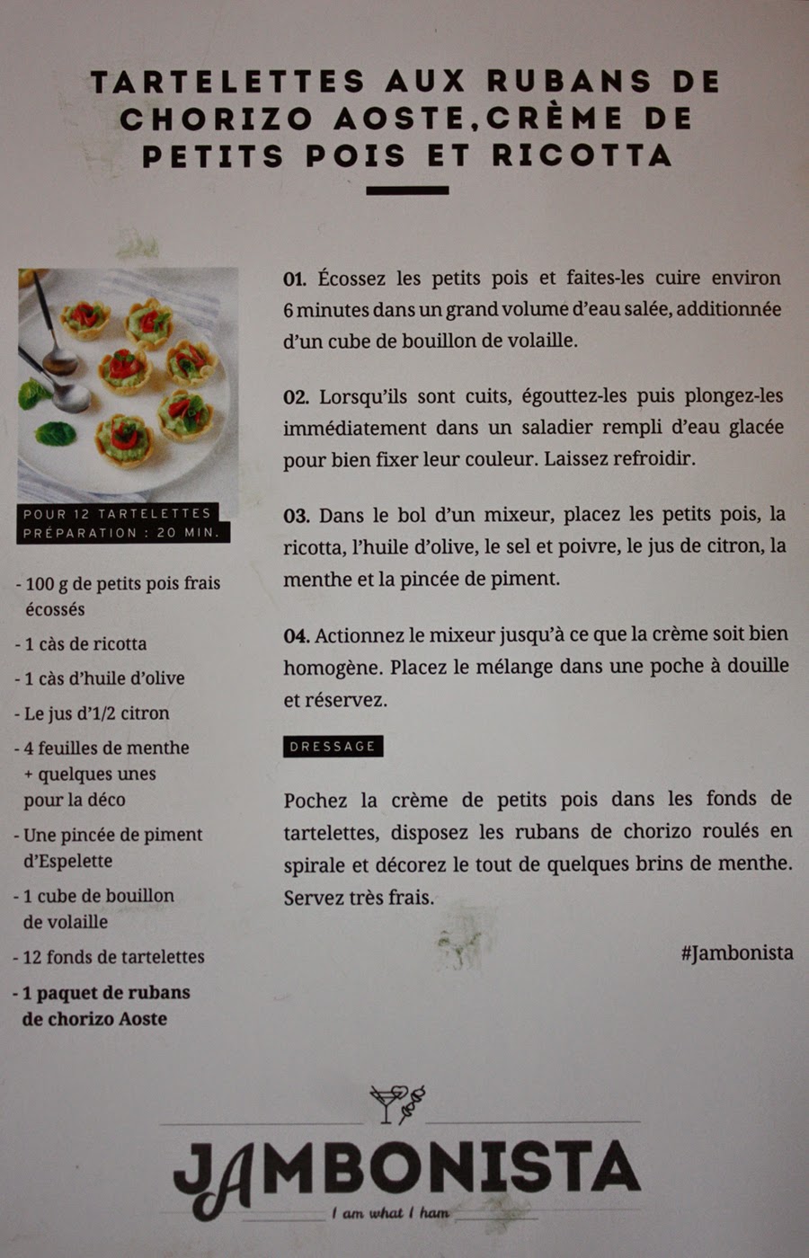 - Tartelettes aux rubans de chorizo Aoste, crème de petits pois et ricotta.