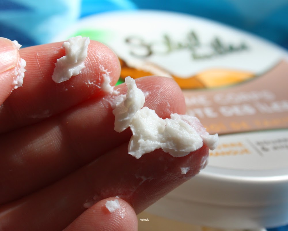 La texture est très épaisse, comme un baume, mais lorsqu’on l’applique sur la peau, il fond rapidement. Il pénètre vite et ne laisse pas de sensation de gras. Son odeur est très agréable, mais ce n’est pas du monoï que l’on sent (en même temps, le produit ne contient que 1% de monoï) mais plutôt une odeur fruité. Cela sent en tout cas super bon.