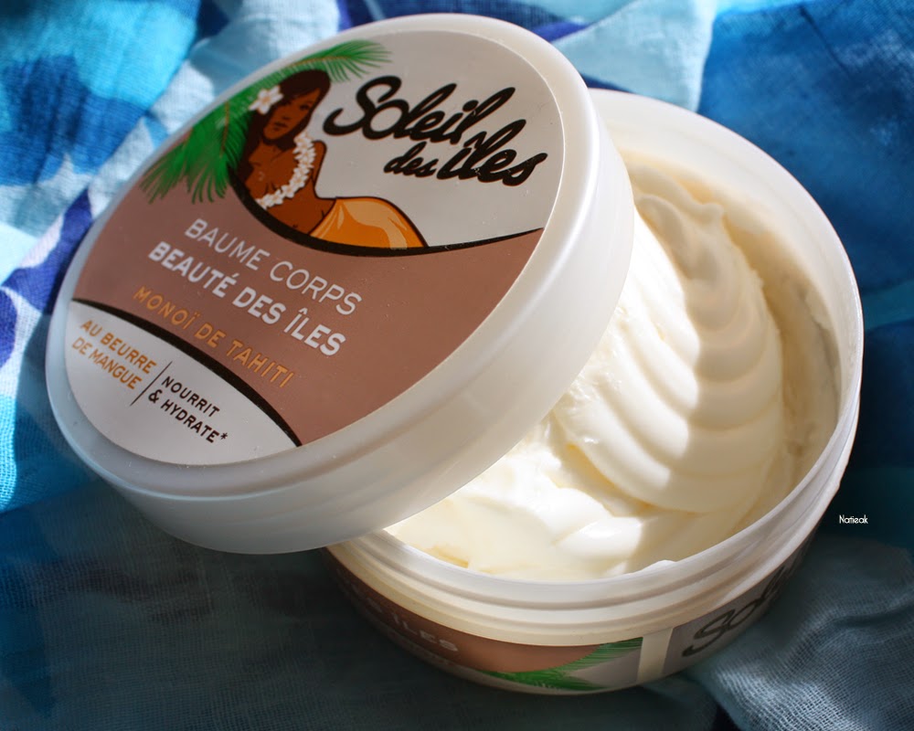 « Soleil des Iles, beauté des Iles, est un baume corporel réparateur, hydratant et doux. Riche en véritable monoï de Tahiti et en beurre de mangue, sans paraben, ce baume moelleux et fondant pénètre facilement la peau sans effet collant, apporte douceur et enveloppe le corps du parfum délicat des îles lointaines. »