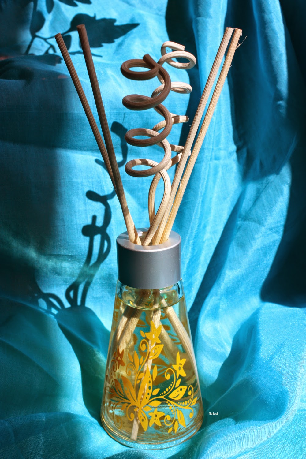 Iba propose toute une gamme d‘objets décoratifs qui diffusent des senteurs très variées. L’avantage est que l’on trouve cette marque dans les GMS (grand et moyen surface) et surtout à petit prix. J’ai eu bien du mal à me décider, et sur le modèle et sur le parfum. J’ai finalement opté pour le spray Figue des Jardins d’Orient et les tiges végétales de rotin.