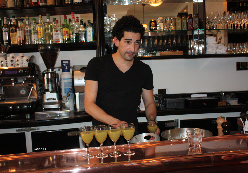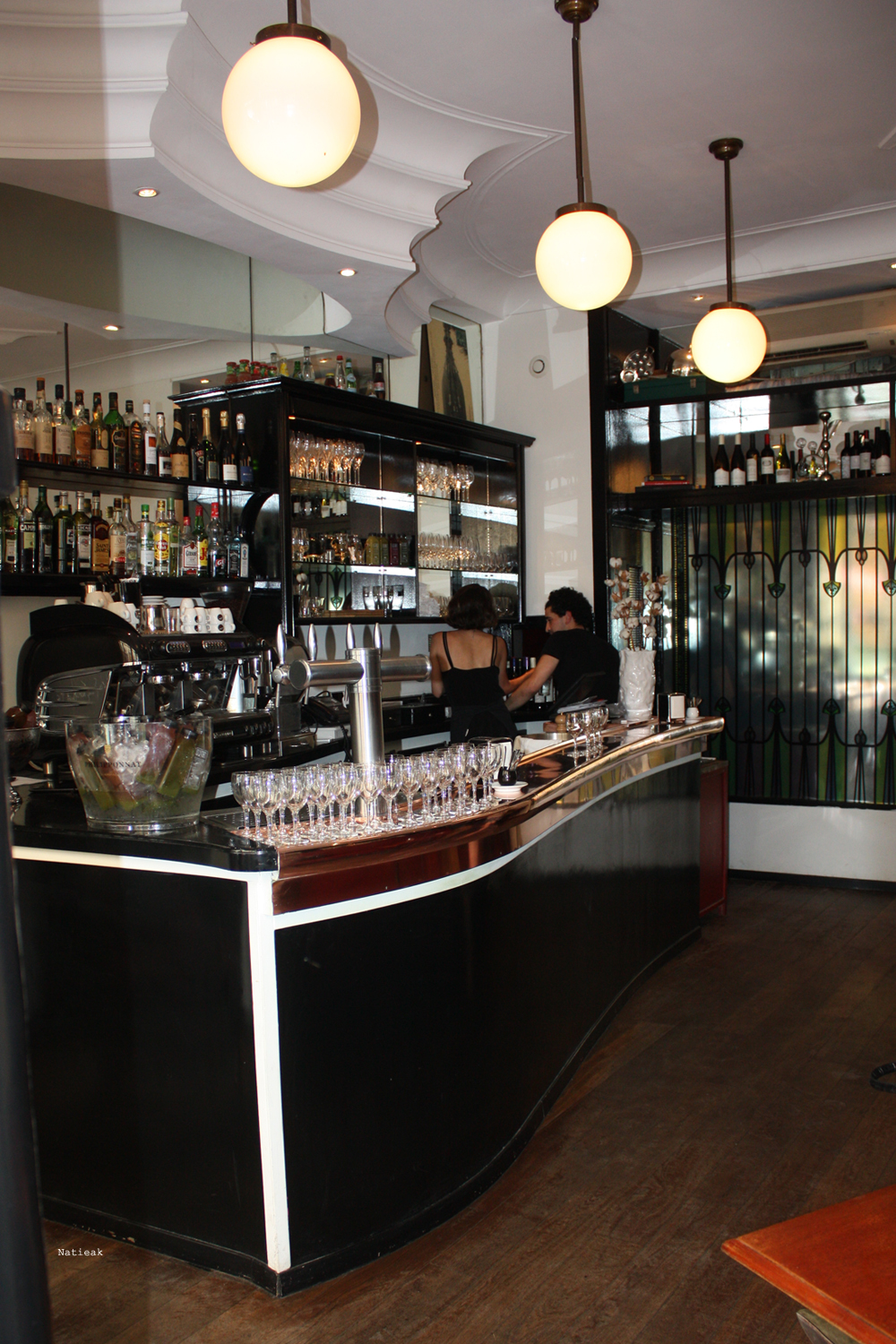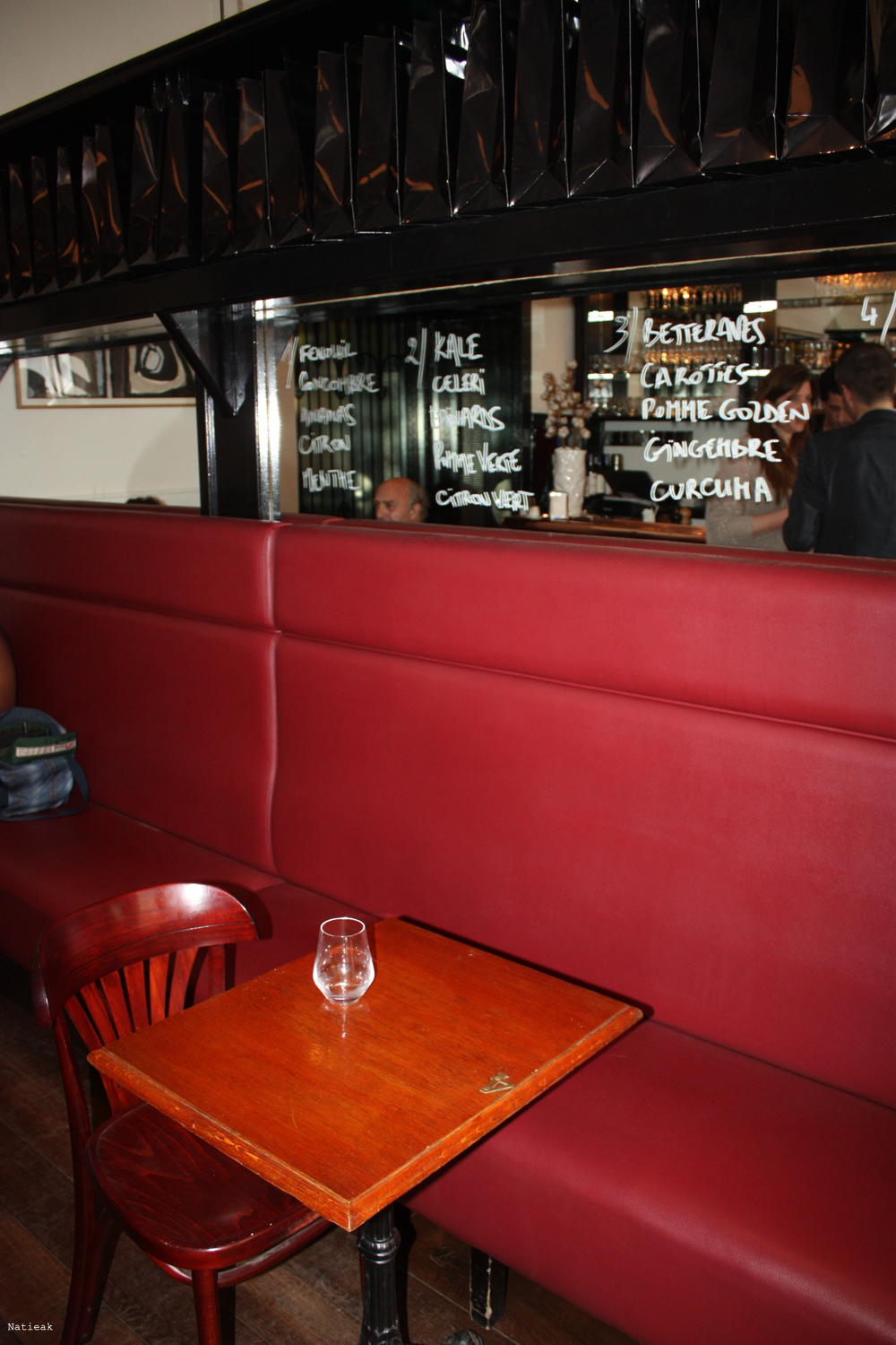 Je découvre l’intérieur du restaurant, une  petite  salle décorée dans un style bistrot moderne : sur la gauche, un grand comptoir en bronze et sur la droite, un long siège en cuir sur toute la longueur de la pièce  où de petites tables en bois lui font face.