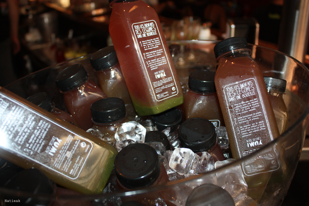 Pour accompagner les hors-d’œuvre,  des  boissons à base de  légumes crus de la marque Yumi nous a été proposées. Le goût est assez fort en bouche et peut en  dérouter plus d’un, surtout lorsqu’on n’en n’a pas l’habitude. Si cela avait été un peu moins imposant, j’aurai peut être plus apprécié ces boissons, mais la fenouil et le céleri ne sont pas passés. Peut-être ai-je besoin d’habituer mon palais.