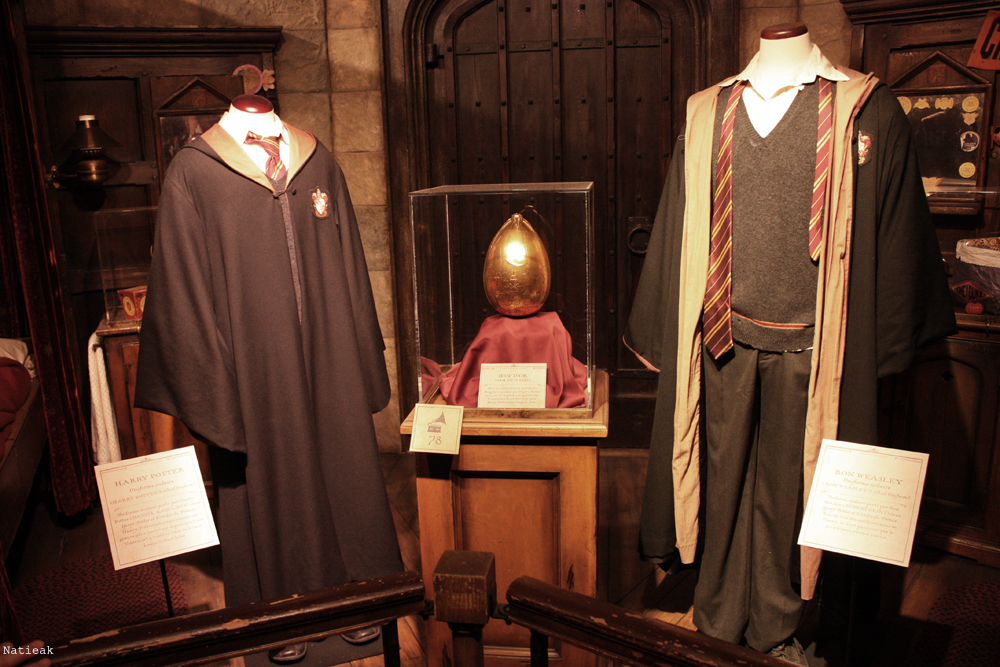 Les costumes scolaires de Harry et de Ron ainsi que l’œuf d’or qui fut arraché aux griffes du Magyar à pointes par Harry Potter au cours de la première épreuve du Tournoi des trois sorciers (Harry Potter et la coupe de feu).