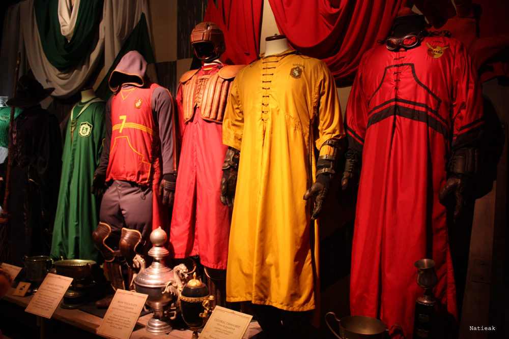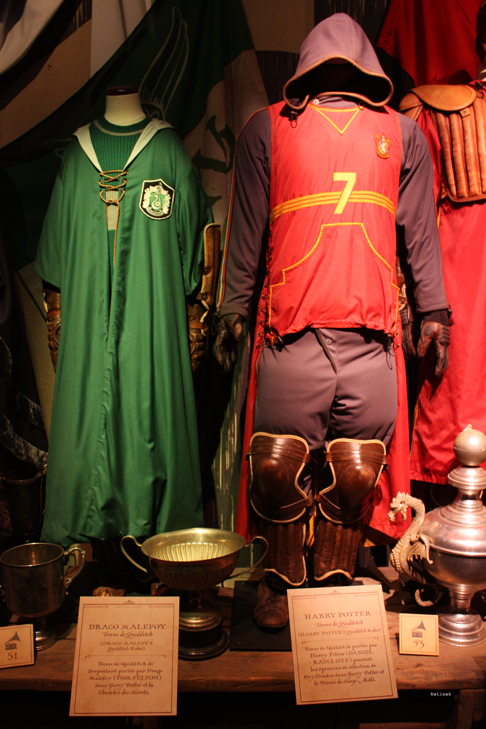 Différentes tenues de Quidditch : on aperçoit la tenu de Drago Malefoy porté dans Harry Potter et la chambre des secrets et celle d’Harry Potter  porté durant l’épreuve de sélection de Gryffondor dans Harry Potter et le Prince de Sang-Mêlé.