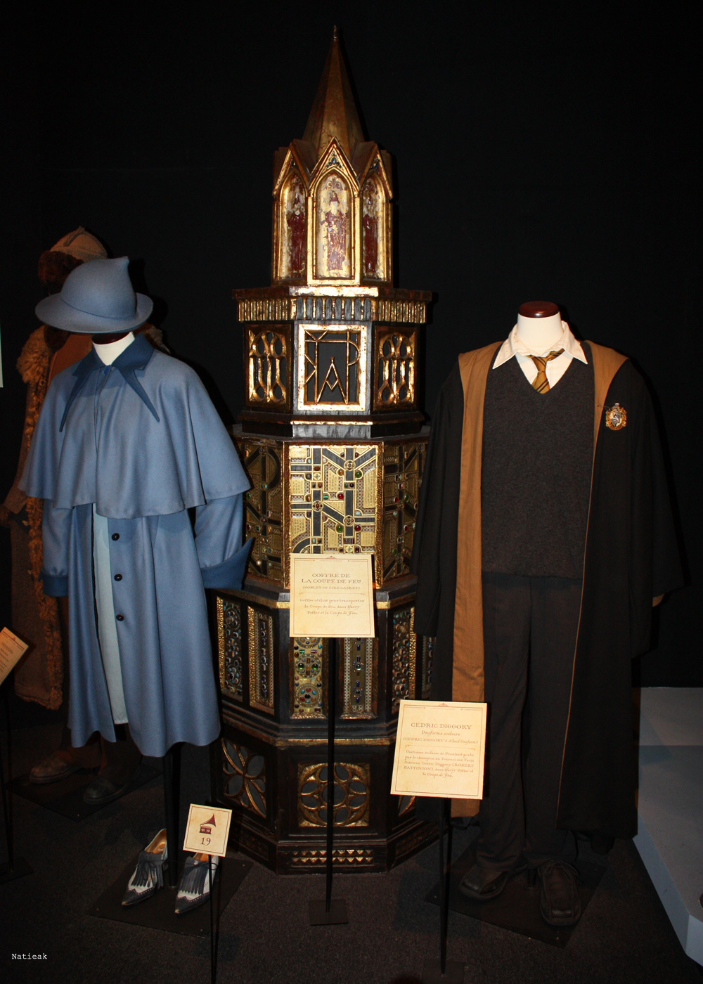 Uniforme de Fleur de la cour  et celui de Cédric Diggory. Au centre  le coffre de la coupe de feu.