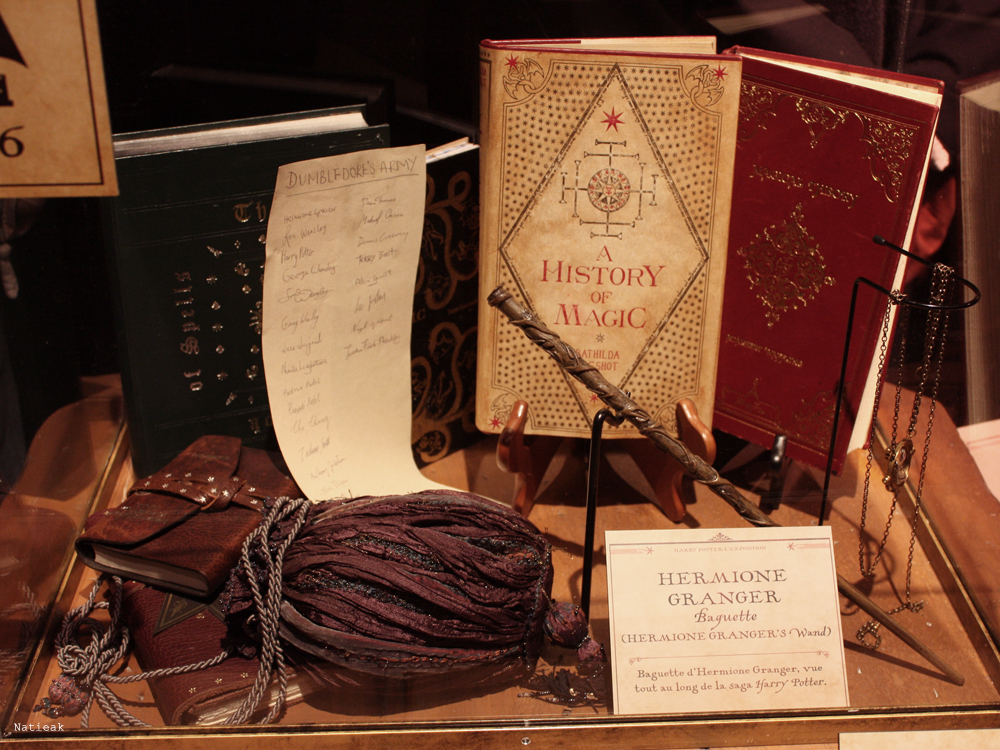 Baguette de Hermione Granger. Petit pendentif : Retourneur de temps, Sac en perles qu’elle a doté d’un sortilège d’extension. La liste de l’armée de Dumbledore.