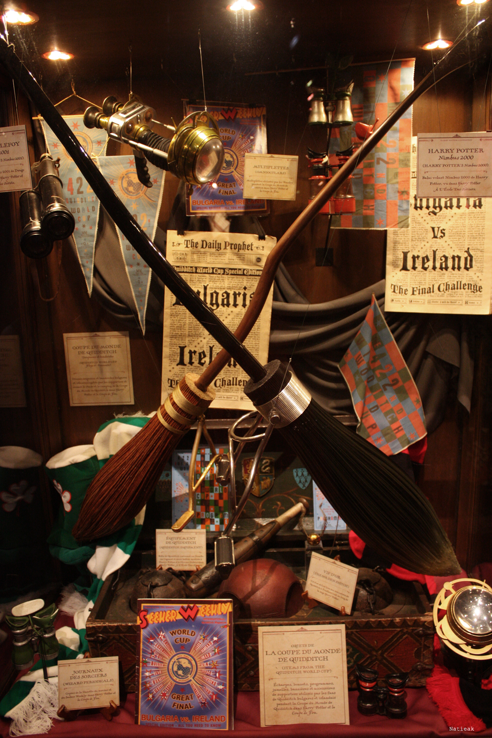 Différents objets de la coupe du monde du  Quidditch, journaux des sorciers, Nimbus 2000 et 2001.