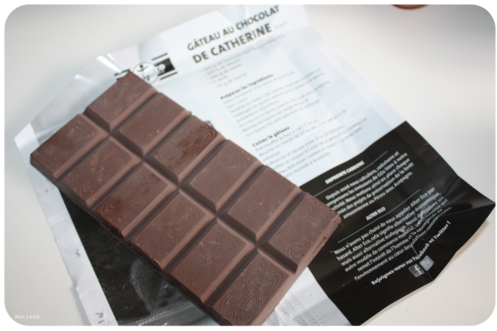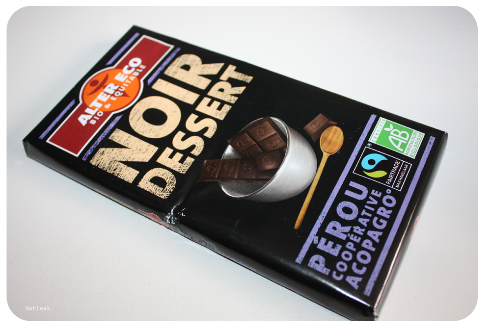 Ce chocolat Noir dessert vient d’une coopérative située au Pérou. On retrouve sur l’emballage une recette de gâteau au chocolat. J’ai l’ai gardé précieusement pour pouvoir la réaliser plus tard.