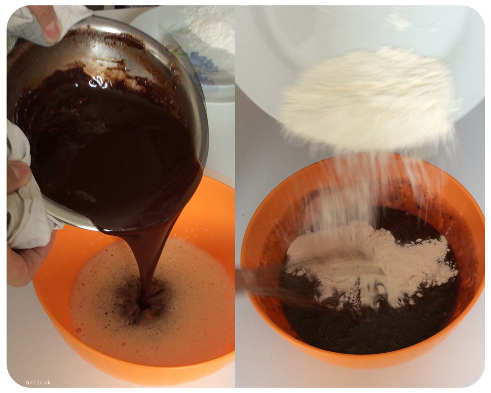 Ensuite, on ajoute le mélange chocolat-beurre puis la farine.