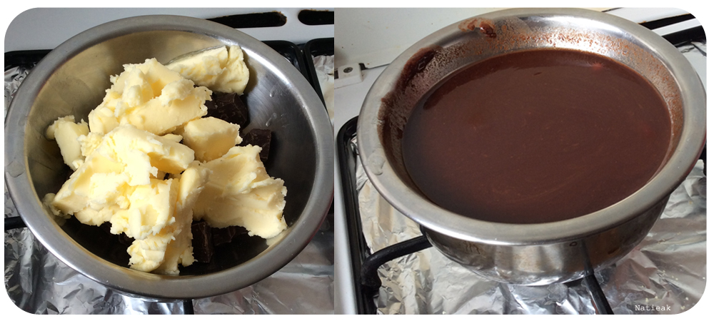 On commence par casser en petit morceau le chocolat puis on le fait fondre au bain-marie avec le beurre que l’on aura également coupé en morceau. Le mélange une fois fondu doit être bien lisse.