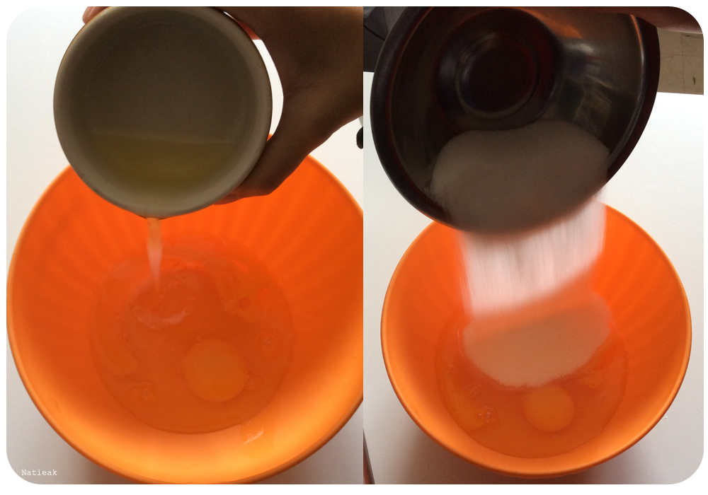 Dans un grand récipient, fouettez les œufs avec le sucre en poudre. On doit obtenir un mélange blanc et mousseux. Pour cela, il faut mélanger les éléments rapidement.