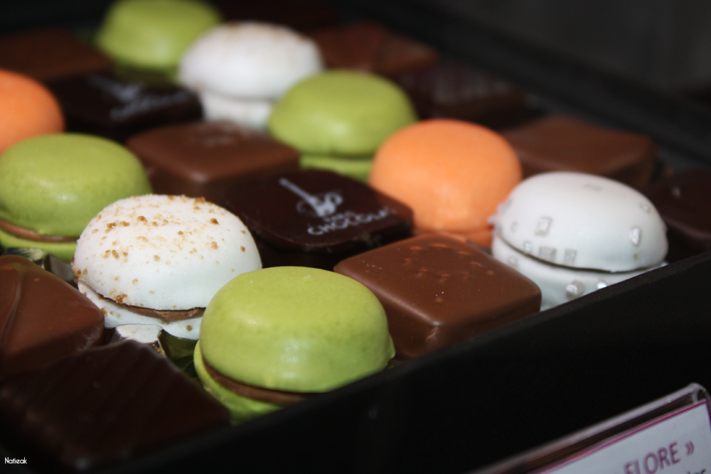 On retrouve les mini-macaronia dans l’écrin Flore avec un assortiment de chocolat.