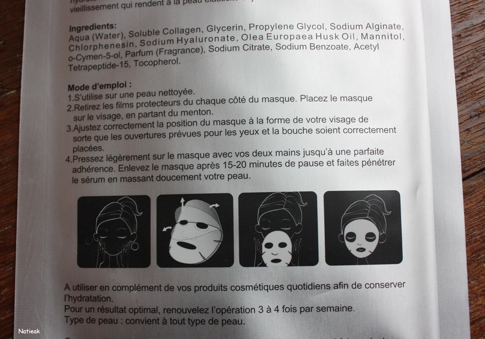 Pour terminer, on masse doucement le visage pour faire pénétrer le reste du sérum. Ma peau est parfaitement bien hydratée. Par contre, je ne pourrai émettre d’avis sur les autres bienfaits que ce masque. Il faudrait pour cela le tester sur une période plus longue.