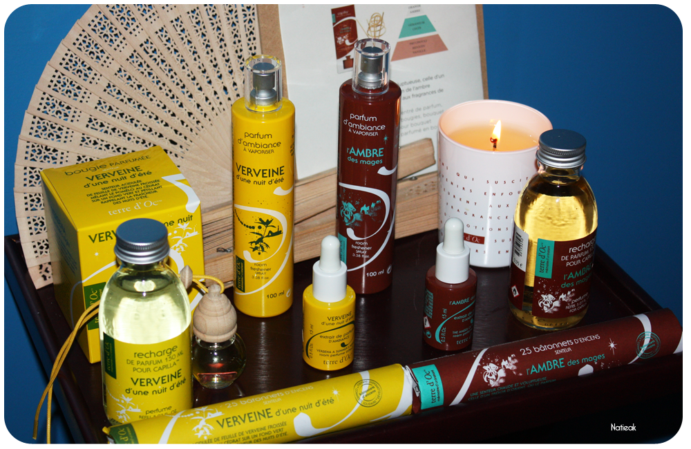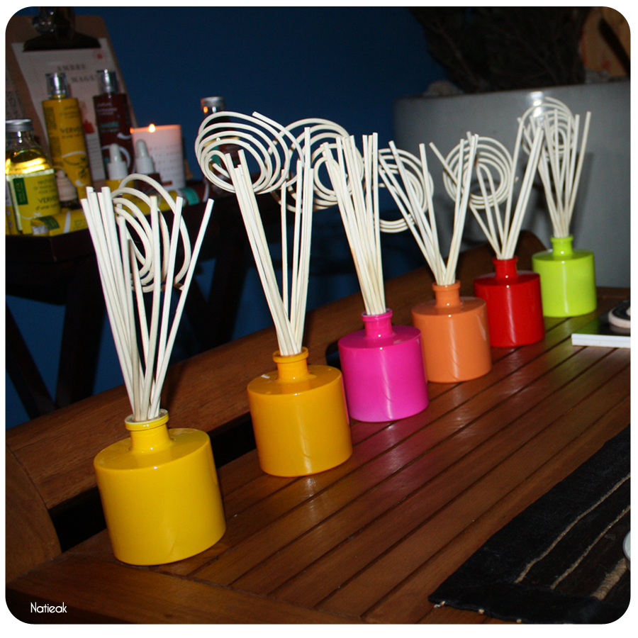 J’ai surtout aimé le capilla diffuseur de parfum avec ses tiges en rotin de Terre d’Oc. Ils existent en plusieurs couleurs selon la fragrance choisie. C’est vraiment tout joli. En voici quelques uns sur la photo ci-dessous mais il en a encore plein d’autres. Le choix est vaste.