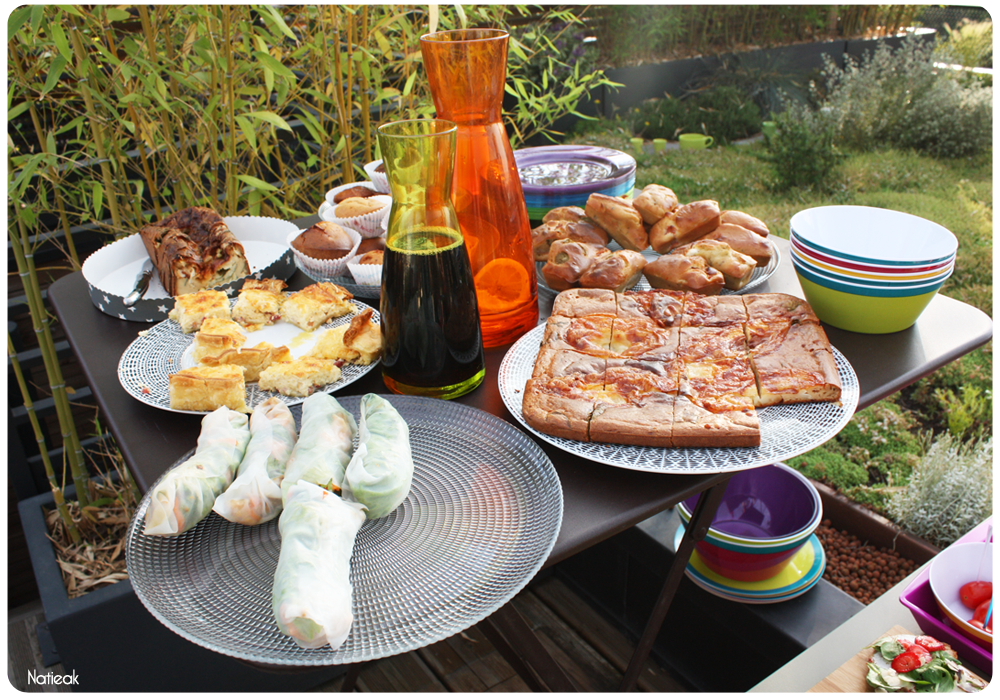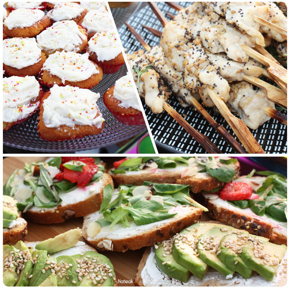J’ai particulièrement craqué sur les petites tartines de La délicate parenthèse : fromage à tartiner accompagné d’avocats, noix, fraises… C’était tellement rafraîchissant en cette soirée caniculaire (merci Ellen pour le parapluie-parasol sans quoi, j’aurai cuit). Mais il y avait encore pleins d’autres gourmandises comme les muffins salés de Miss Figolu, la quiche lorraine de La minute d’Emy, des brochettes, rouleau de printemps… Je ne pourrais pas tous les citer car la liste est longue ! En dessert, ce gâteau fraise a eu un très grand succès. Elle sont douées ces blogueuses.