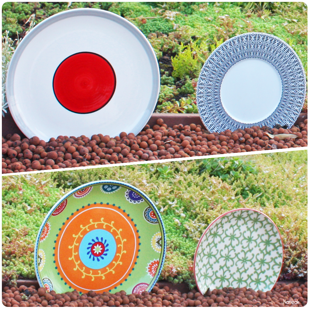 Après avoir monté quelques escaliers dans l’appartement, je suis arrivée sur cette terrasse très spacieuse. C’est ainsi que j’ai découvert de façon très originale, la nouvelle collection art de la table de E.Leclerc maison. Un chemin de jolies assiettes décoraient un tremplin verdoyant.