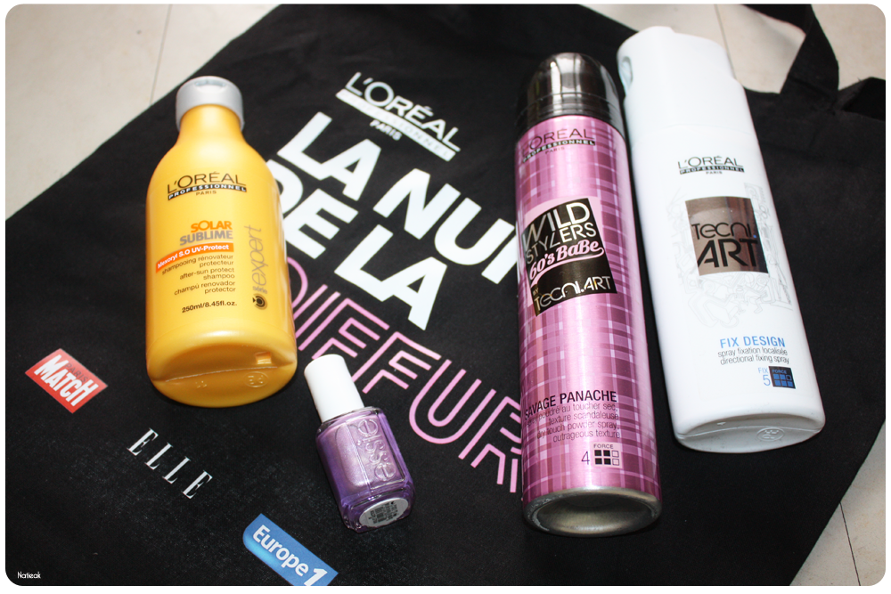 Au moment de repartir, on nous a remis un tote bag contenant plusieurs produits l’Oréal : un shampooing rénovateur, un spray fixation et un spray au touchez sec. J’ai eu la surprise de découvrir également un vernis Essie « Violet Auction ». Public étant un partenaire de la soirée, un magasin y avait été glissé.